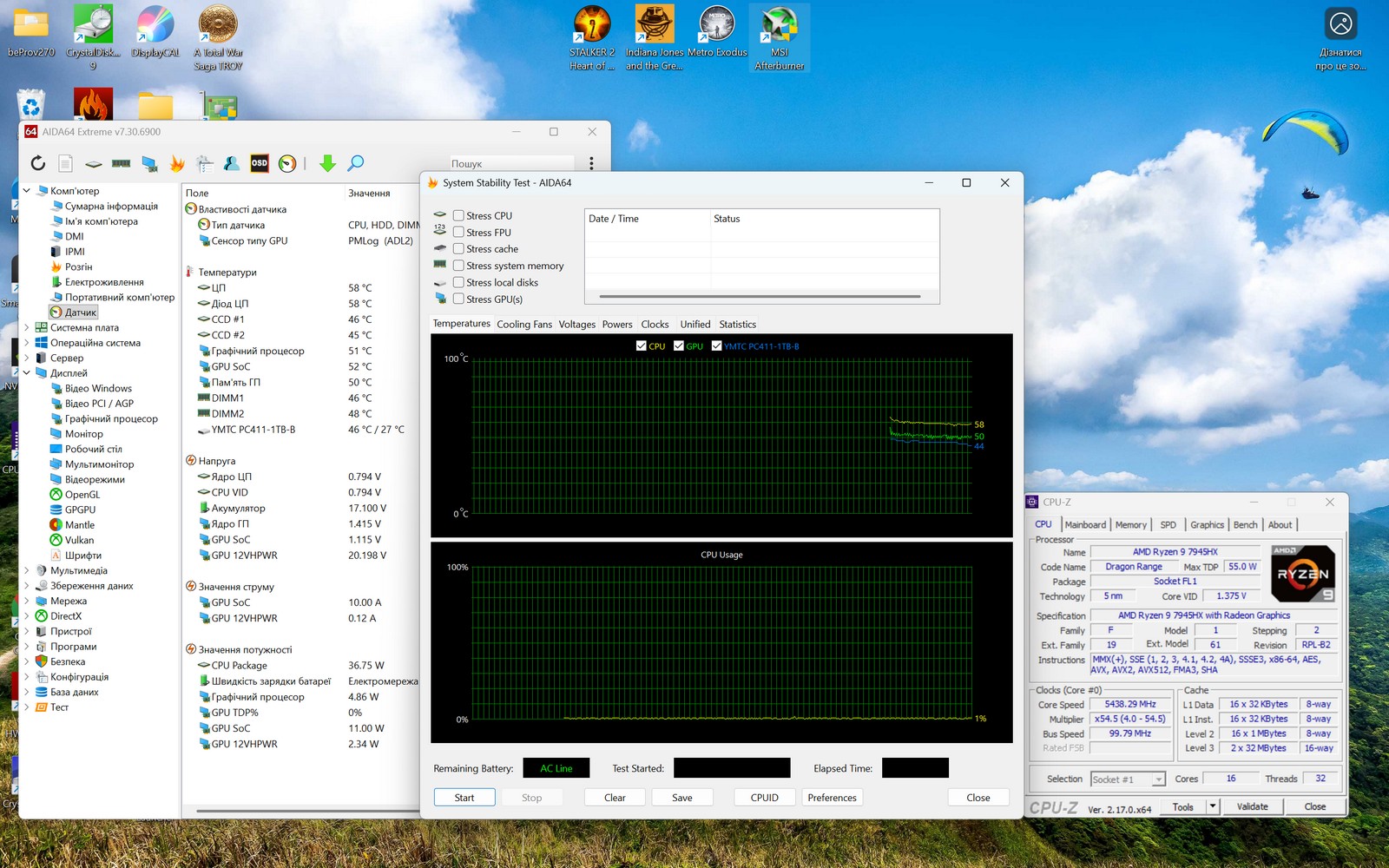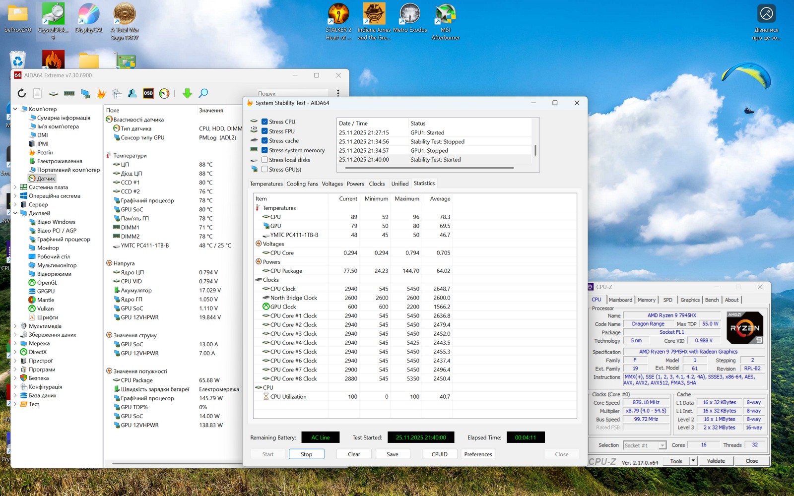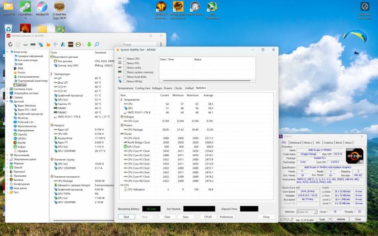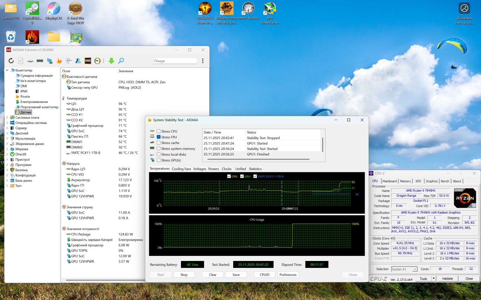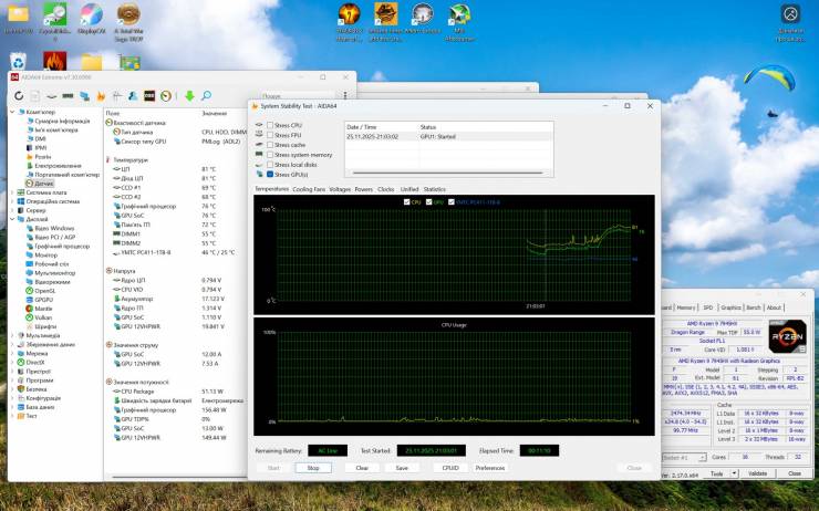 При полном стресс-тесте AIDA64 (CPU, FPU, Cache, RAM) температура CPU достигла 96°C. Все ядра работали на частоте 2,94 ГГц без признаков тротлинга. Потребление CPU Package достигло 144Вт – это полная нагрузка всех вычислительных блоков. Вентиляторы работали на больших оборотах, но без резких шумовых пиков.