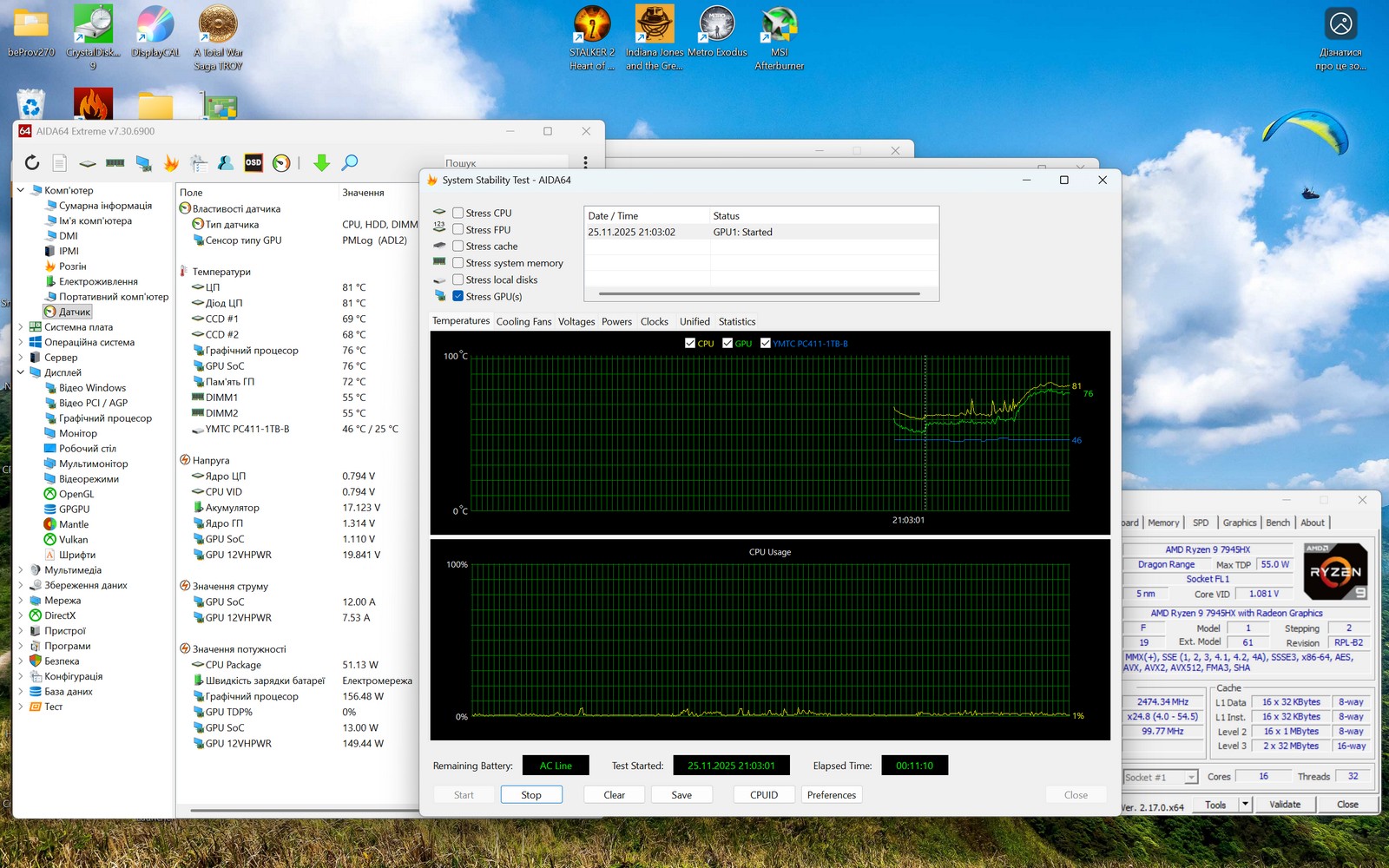 Во время отдельной нагрузки на GPU температура видеокарты достигла 76°C, потребление – 156 Вт (149Вт по 12VHPWR). CPU оставался без активной нагрузки: 81°C и 51 Вт. Система охлаждения справилась без просадок частот или шумовых пиков.