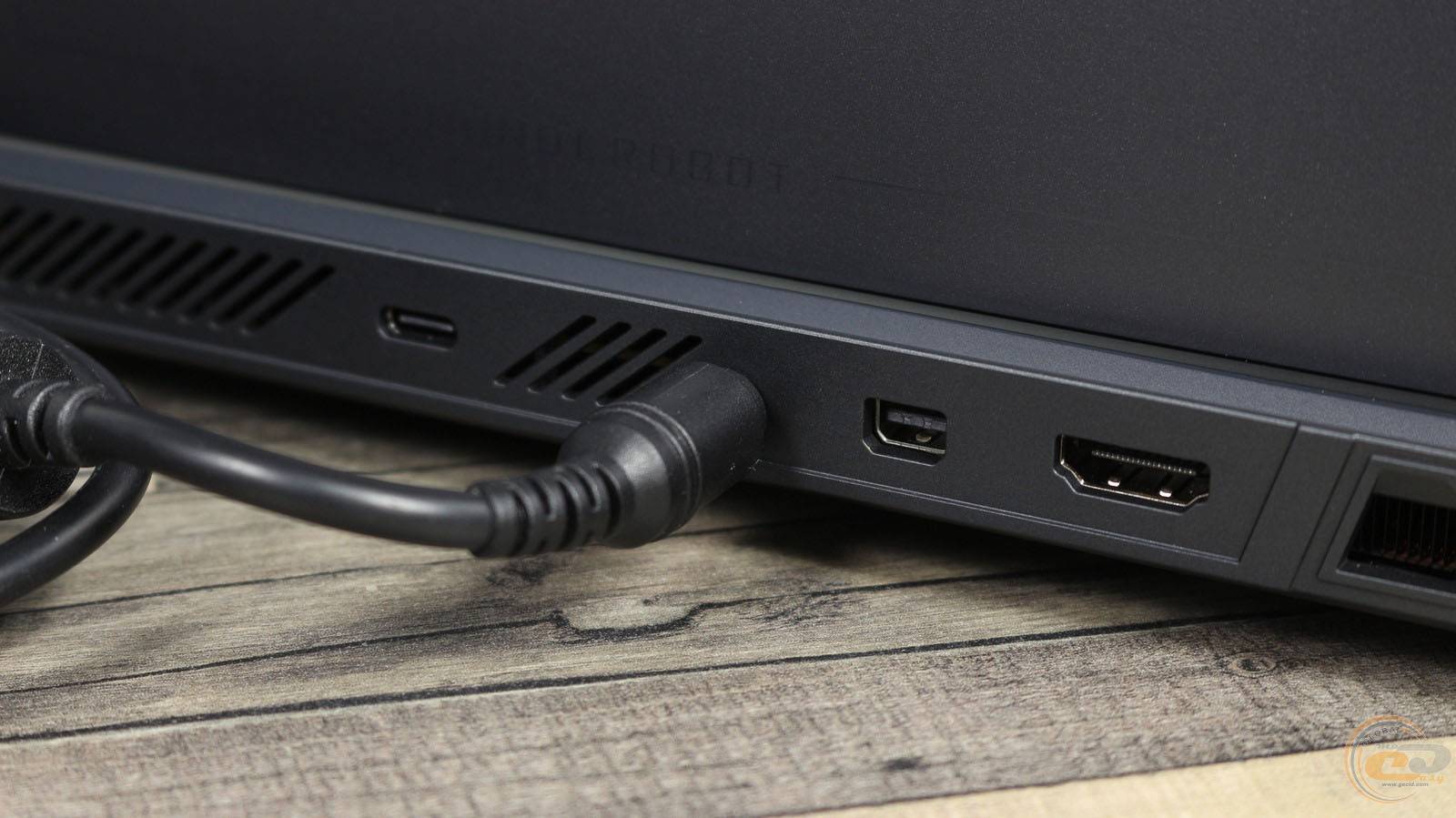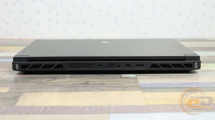 Задняя часть Thunderobot RS16 совмещает функциональность и сдержанный технический стиль. В центре расположены основные порты: разъем питания, USB-C 3.2 Gen2 со скоростью передачи до 10 Gbps и поддержкой Power Delivery (до 100 Вт, совместимый с блоками на 140 Вт), который можно использовать как для подзарядки периферии, так и для подпитки ноутбука. Рядом расположены Mini DisplayPort и HDMI. С обеих сторон находится широкая вентиляционная решетка, которая обеспечивает эффективный отвод теплого воздуха. Продольный выступ вдоль задней панели не только укрепляет корпус, но и придает поверхности структурированного, аккуратного вида.