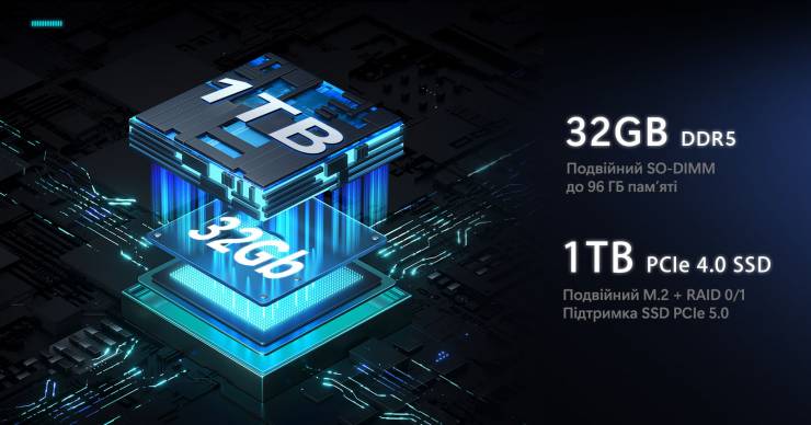 Объем ОЗУ и SSD достаточный для большинства сценариев, а при необходимости обе подсистемы легко усовершенствовать: два слота под накопители, до 96ГБ оперативной памяти.