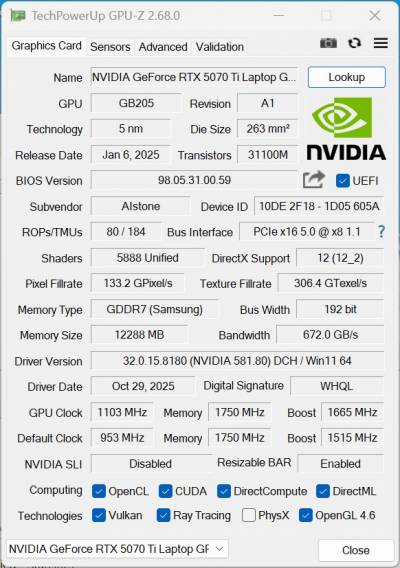 За игровую производительность отвечает видеокарта NVIDIA GeForce RTX 5070 Ti Laptop GPU (GB205, 5-нм). Она имеет 5888 CUDA-ядер, 12 ГБ памяти GDDR7 (Samsung), 192-битную шину и пропускную способность 672 ГБ/с. Поддерживаются все современные графические API: DirectX 12_2, Vulkan, CUDA, OpenCL, Ray Tracing, PhysX. Базовая частота ядра составляет 1103 МГц, Boost – до 1665 МГц.