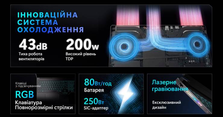 Система охлаждения включает в себя два вентилятора радиального типа, которые создают активный воздушный поток через четыре радиатора. Тепло от CPU и GPU отводится пятью тепловыми трубками, охватывающими ключевые зоны кристаллов и VRM. Все элементы соединены в единую тепловую рампу, что обеспечивает эффективное рассеяние тепла даже при продолжительной нагрузке.