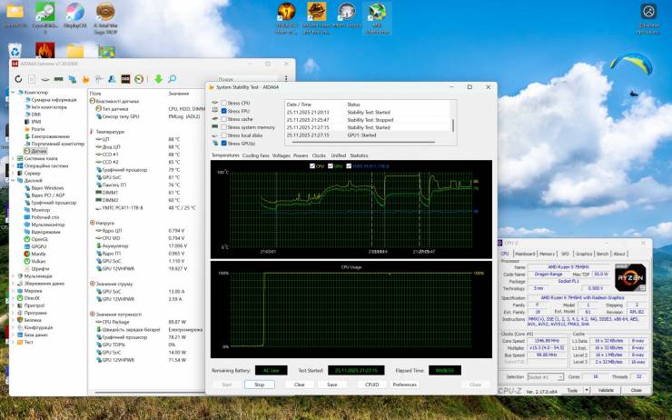 Комплексный прогрев GPU и FPU в AIDA 64 смоделировал наихудший сценарий: температура GPU – 79°C, CPU – 96°C, потребление – более 150 Вт и 85 Вт соответственно. Частоты оставались стабильными, троллинг отсутствует. Вентиляторы работали на грани, но система не потеряла контроля.