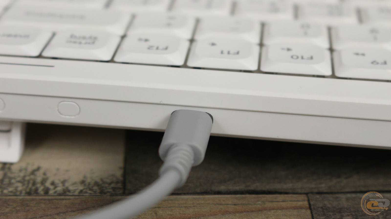 Корпус клавиатуры изготовлен из высококачественного белого пластика с микрорельефом. Материал не скользкий, не глянцевый и не собирает отпечатки пальцев. Качество сборки – отличное: при умышленном скручивании корпус лишь немного изгибается, однако общая жесткость достаточна для ежедневной работы.