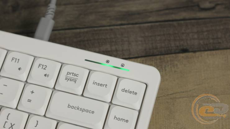 В правом верхнем углу – два зеленых светодиода, отвечающих за Caps Lock и Scroll Lock. Светят ярко, но не слепят. Расположение логичное – рядом с блоком Insert/Delete, не мешают и не отвлекают.
