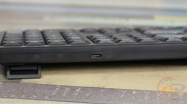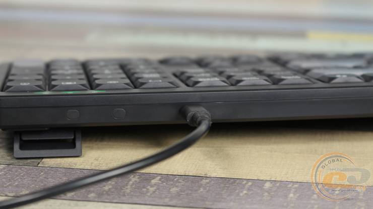На дне клавиатуры расположена наклейка со служебной информацией и четыре резиновые ножки, обеспечивающие надежное сцепление с поверхностью. Дополнительно предусмотрены двухступенчатые прорезиненные ножки с четкой фиксацией, позволяющие поднять заднюю часть на 6 или 13 мм.