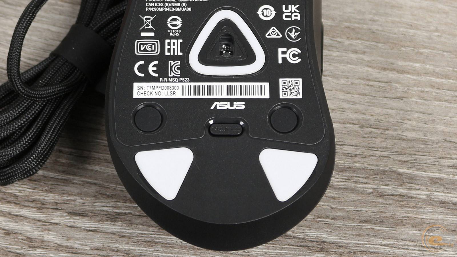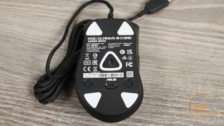На нижней части корпуса расположены пять глайдов из белого PTFE: четыре основных треугольной формы по углам и один центральный – в виде кольца с треугольной геометрией вокруг сенсора. Все они имеют скругленные края и изготовлены из 100% чистого тефлона. Предусмотрено углубление для смены глайдов, что делает процесс обслуживания удобным. Оптический сенсор расположен в геометрическом центре корпуса. Центральная часть дна содержит наклейку с названием модели, серийным номером, техническими характеристиками, QR-кодом и сертификационными логотипами. Наклейка не выступает над поверхностью и не создает трение.