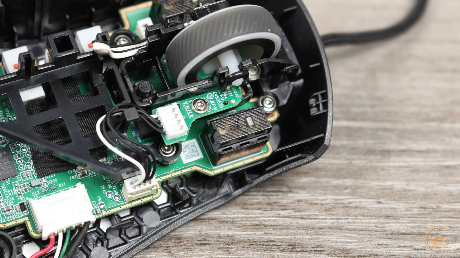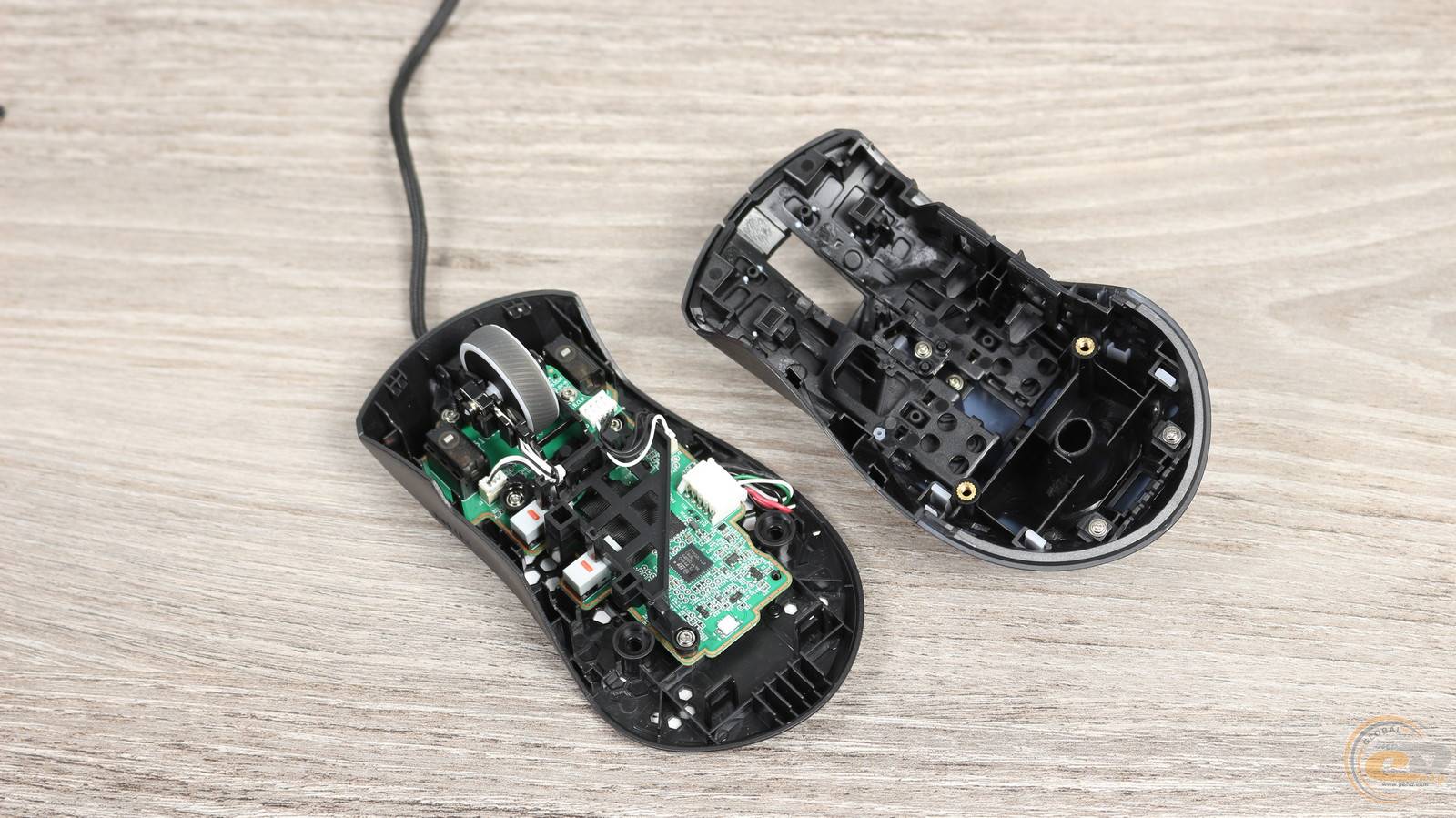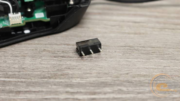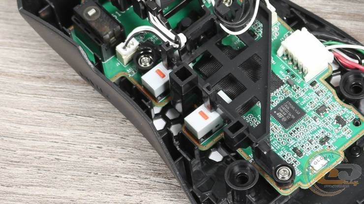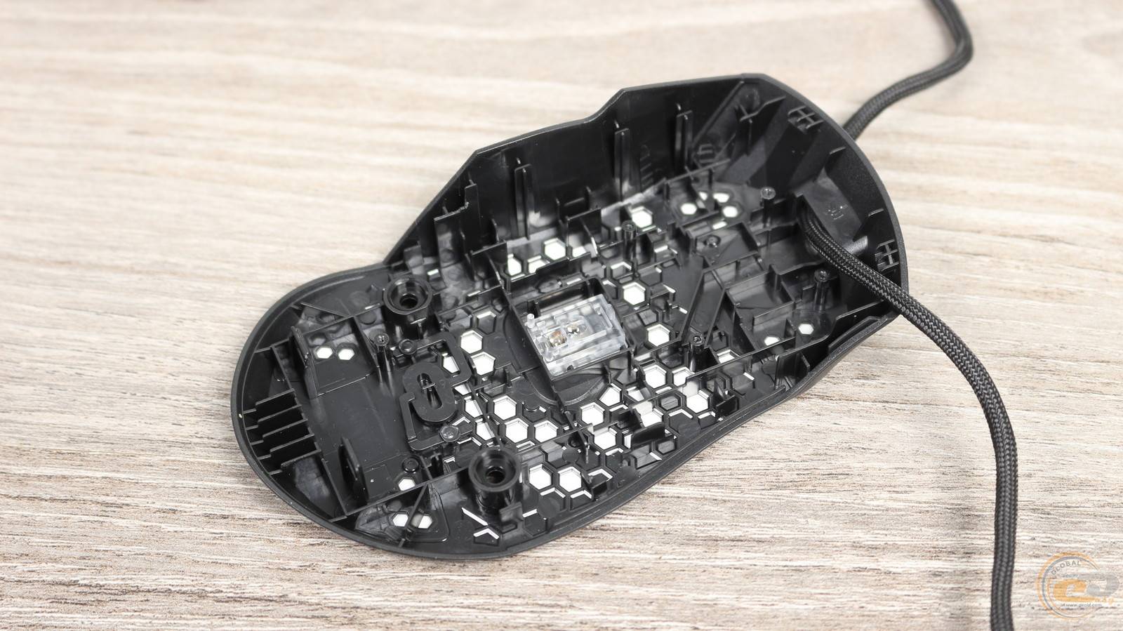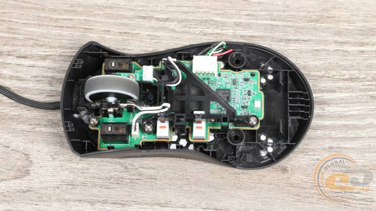 Линза оптической системы расположена на дне корпуса. Для уменьшения веса мышки оно имеет многочисленные отверстия в виде сот.