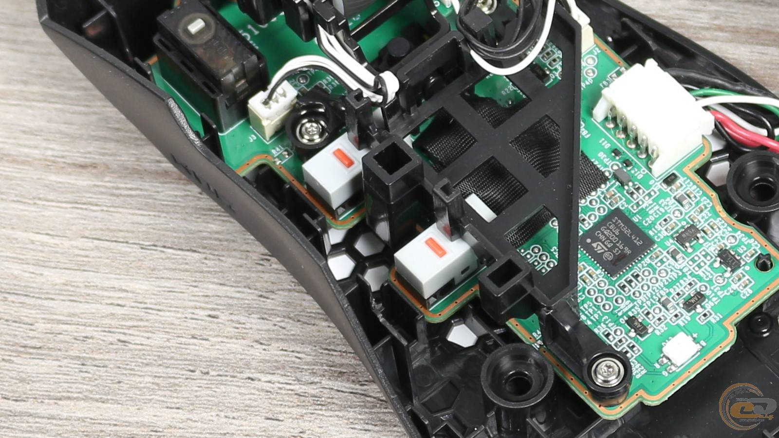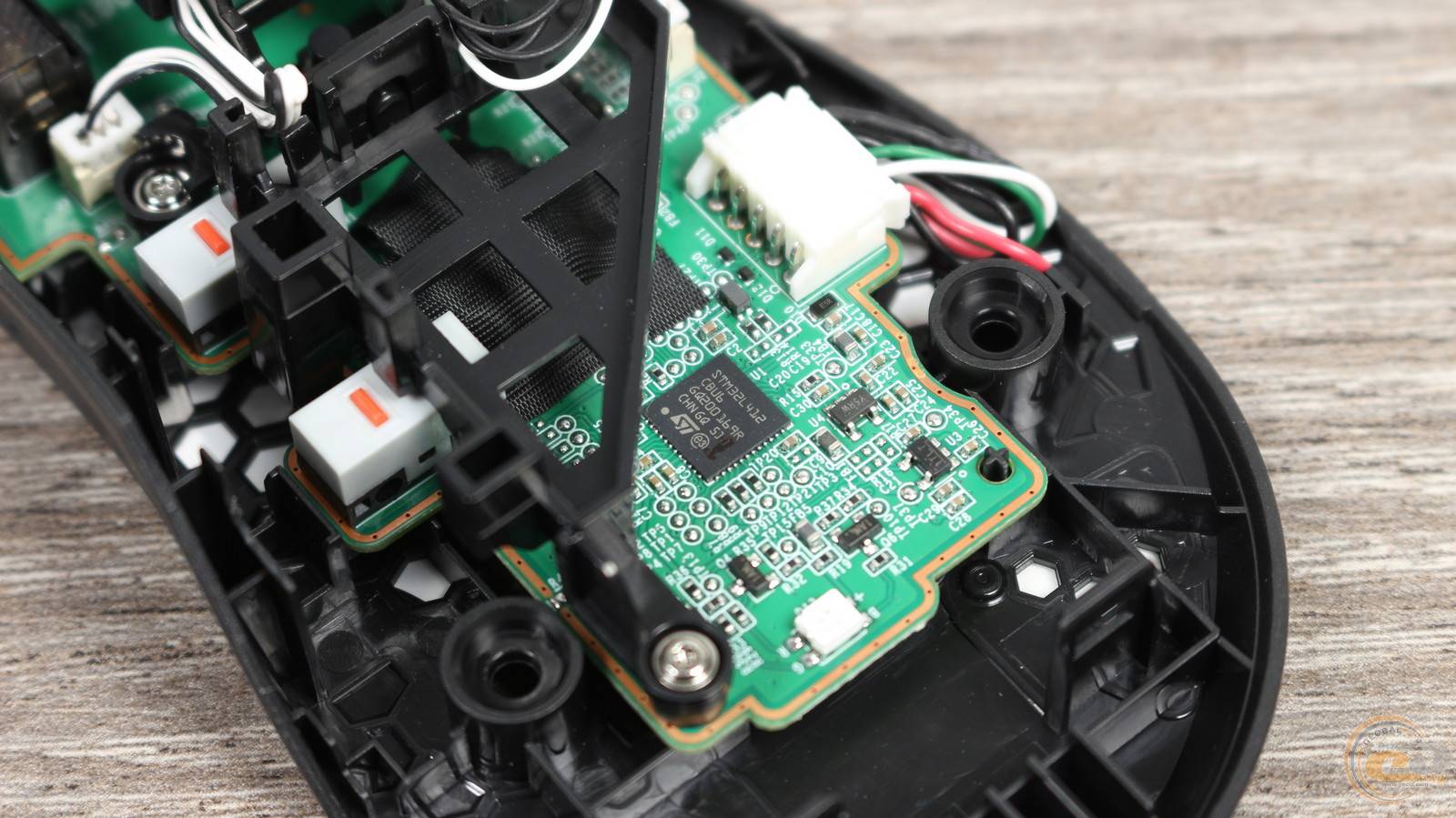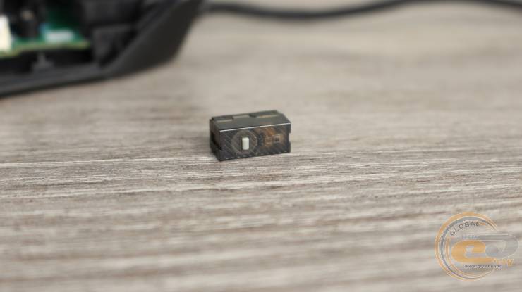 По центру платы – оптический сенсор PAW 3311 с разрешением 12000 DPI. Он прикрыт текстильной накладкой. Ниже – контроллер STM32L. Рядом – RGB-светодиод, подсвечивающий логотип ROG на спинке мыши.