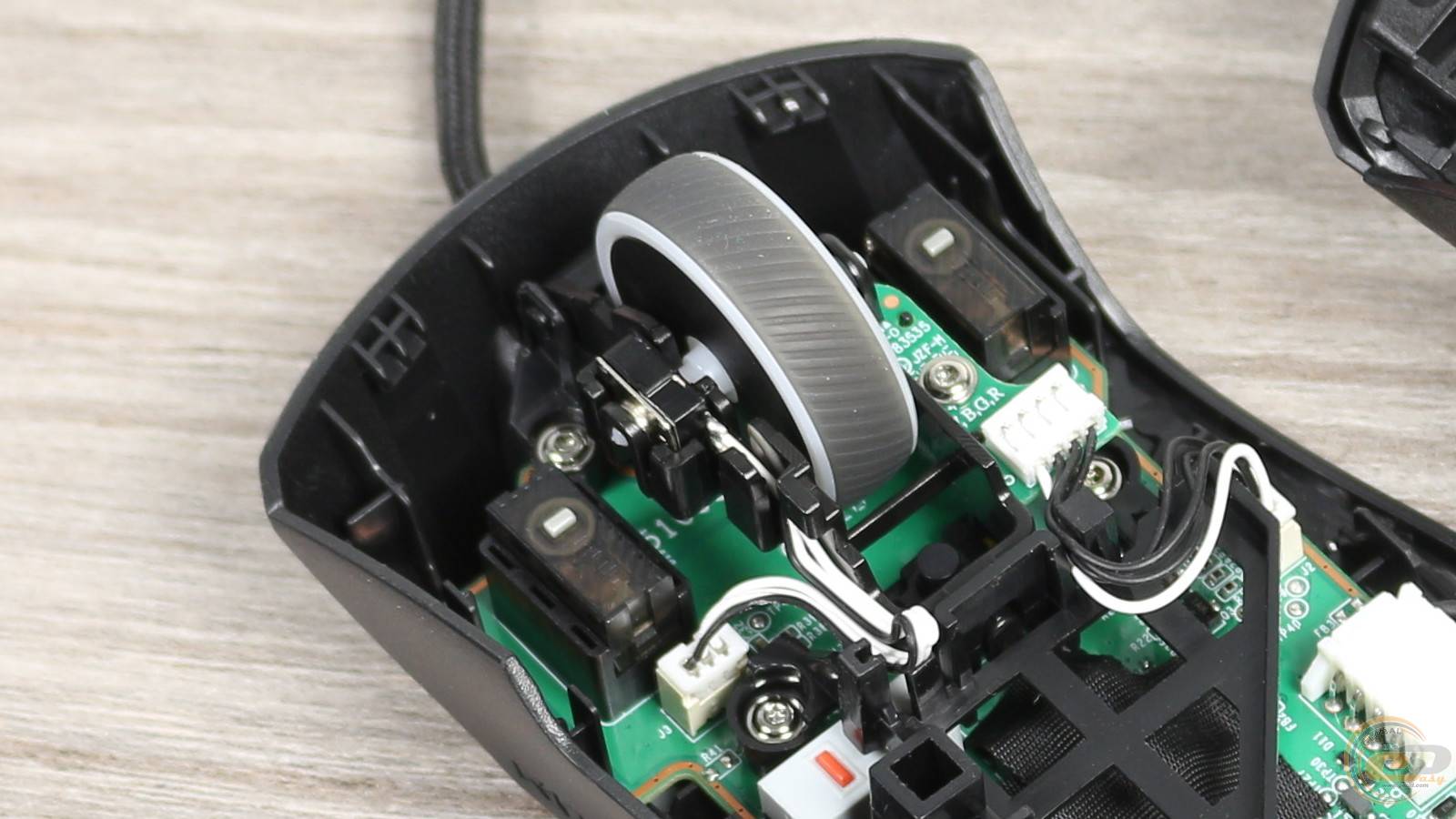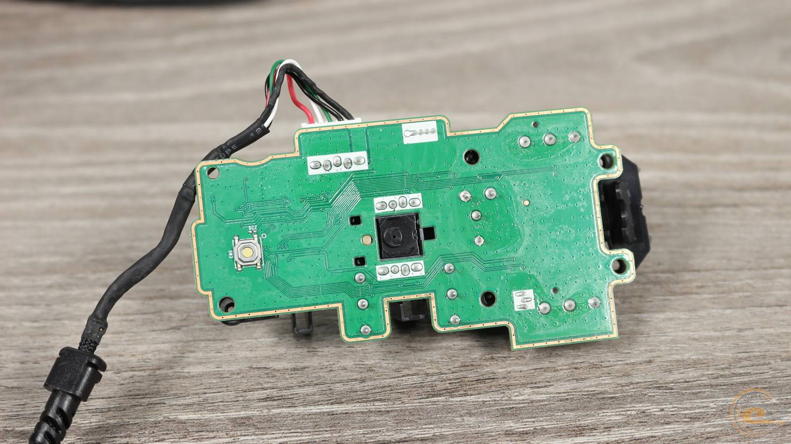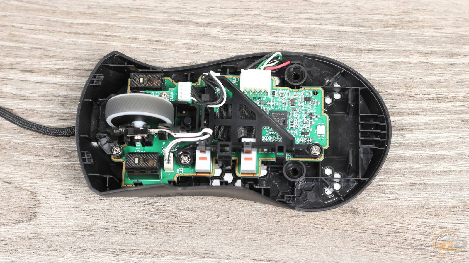 По центру платы – оптический сенсор PAW 3311 с разрешением 12000 DPI. Он прикрыт текстильной накладкой. Ниже – контроллер STM32L. Рядом – RGB-светодиод, подсвечивающий логотип ROG на спинке мыши.