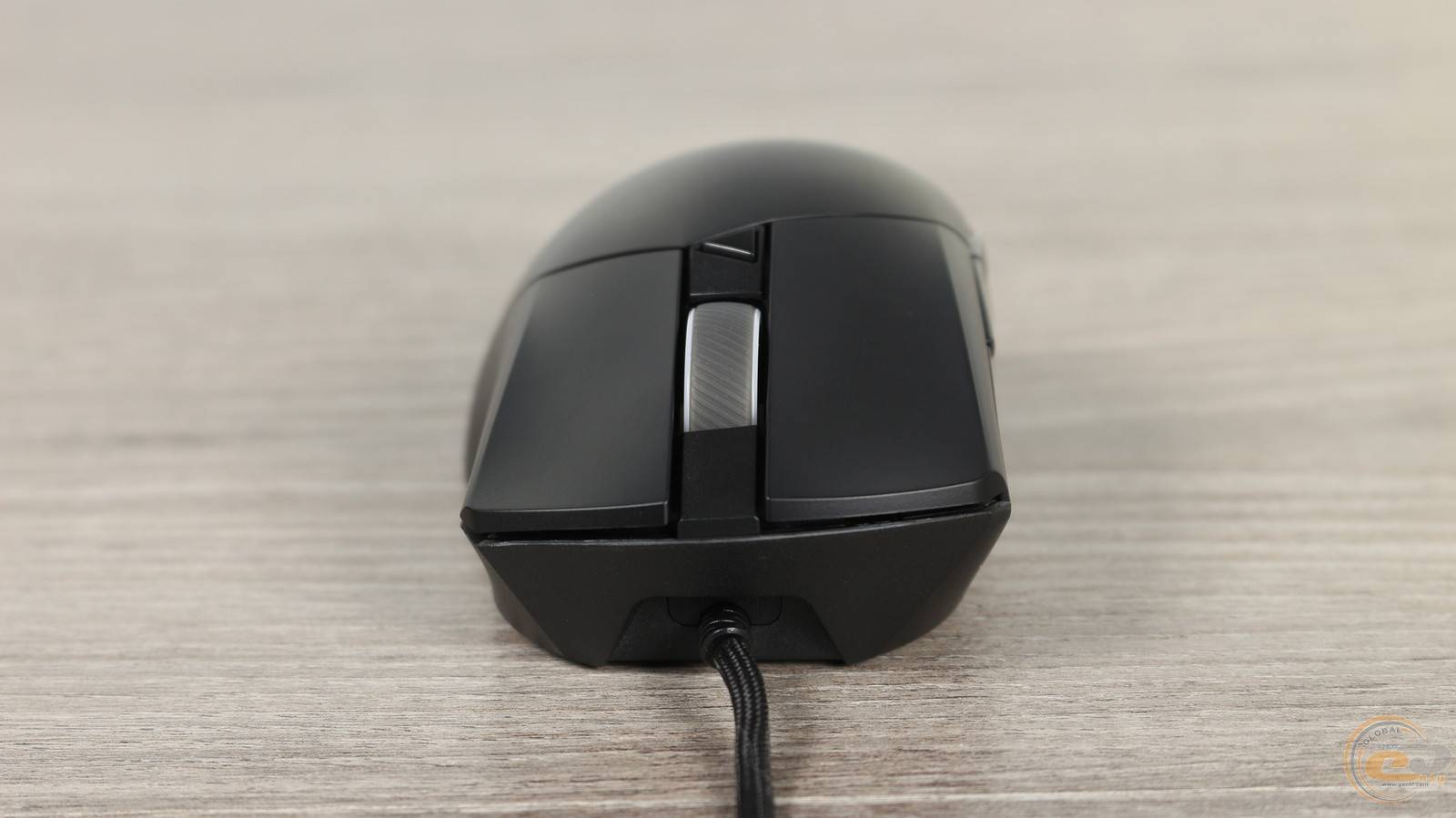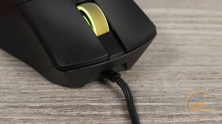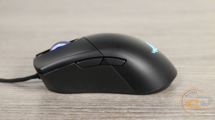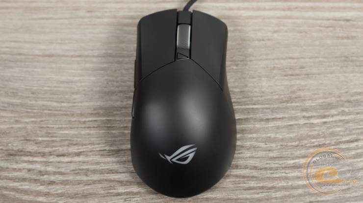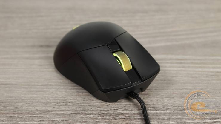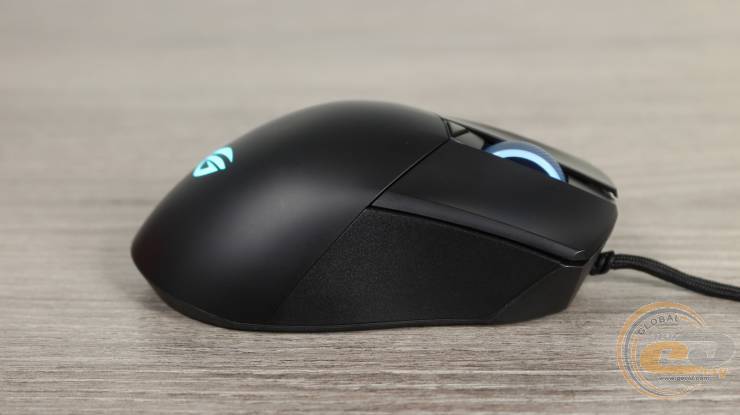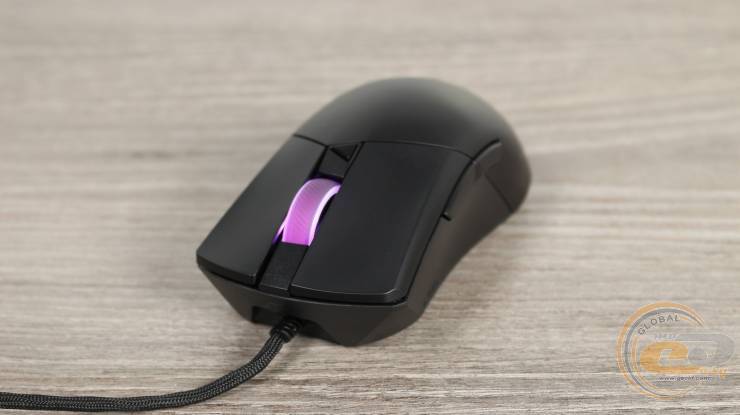 В верхней части расположено полупрозрачное колесико прокрутки с резиновым протектором и диагональными насечками. Оно поддерживает RGB подсветку и ASUS Aura Sync. Рядом находится небольшая треугольная кнопка переключения DPI. Основные кнопки отделены от спинки – это характерная черта конструкции Gladius, которая обеспечивает четкий ход и стабильность нажатия. Левая основная кнопка больше правой – и по площади, и по форме, соответствующей естественному положению пальцев во время хвата.