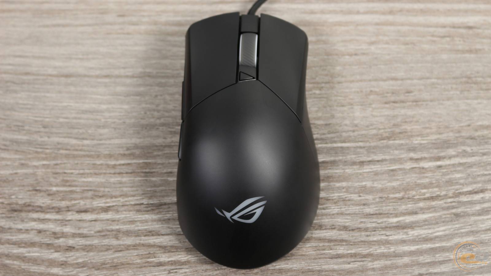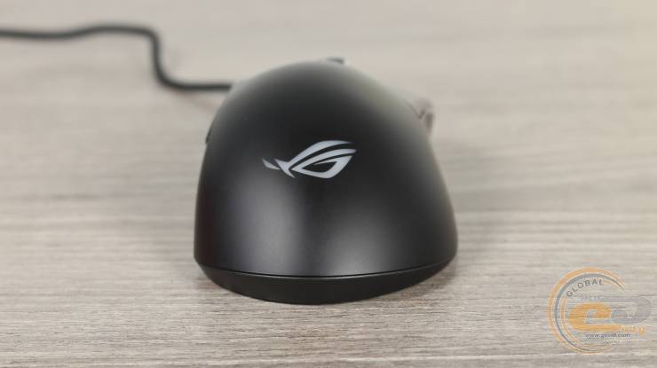Ближе к задней части нанесен логотип ROG с RGB-подсветкой, синхронизированной с колесом прокрутки с помошью ASUS Aura Sync.