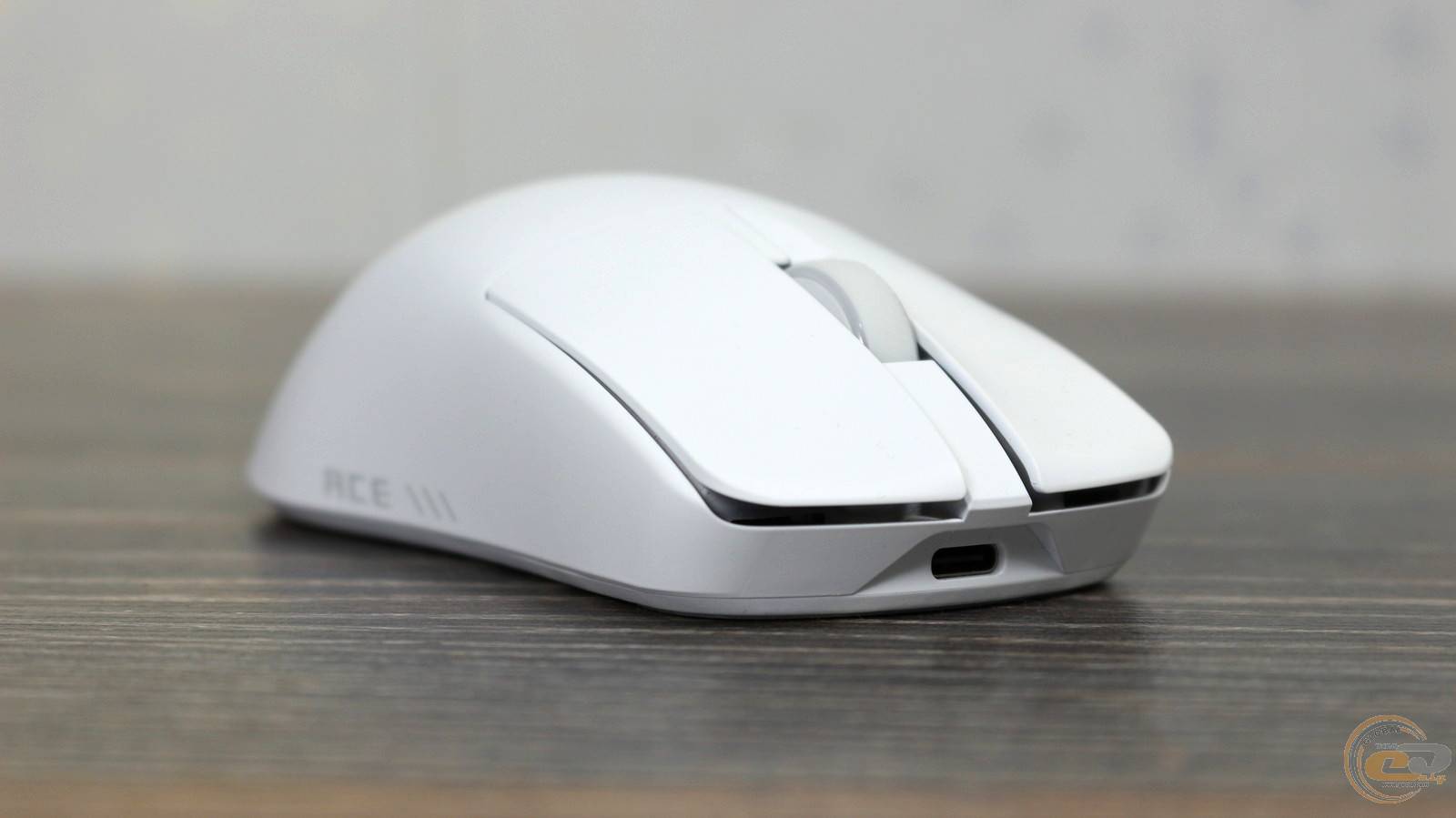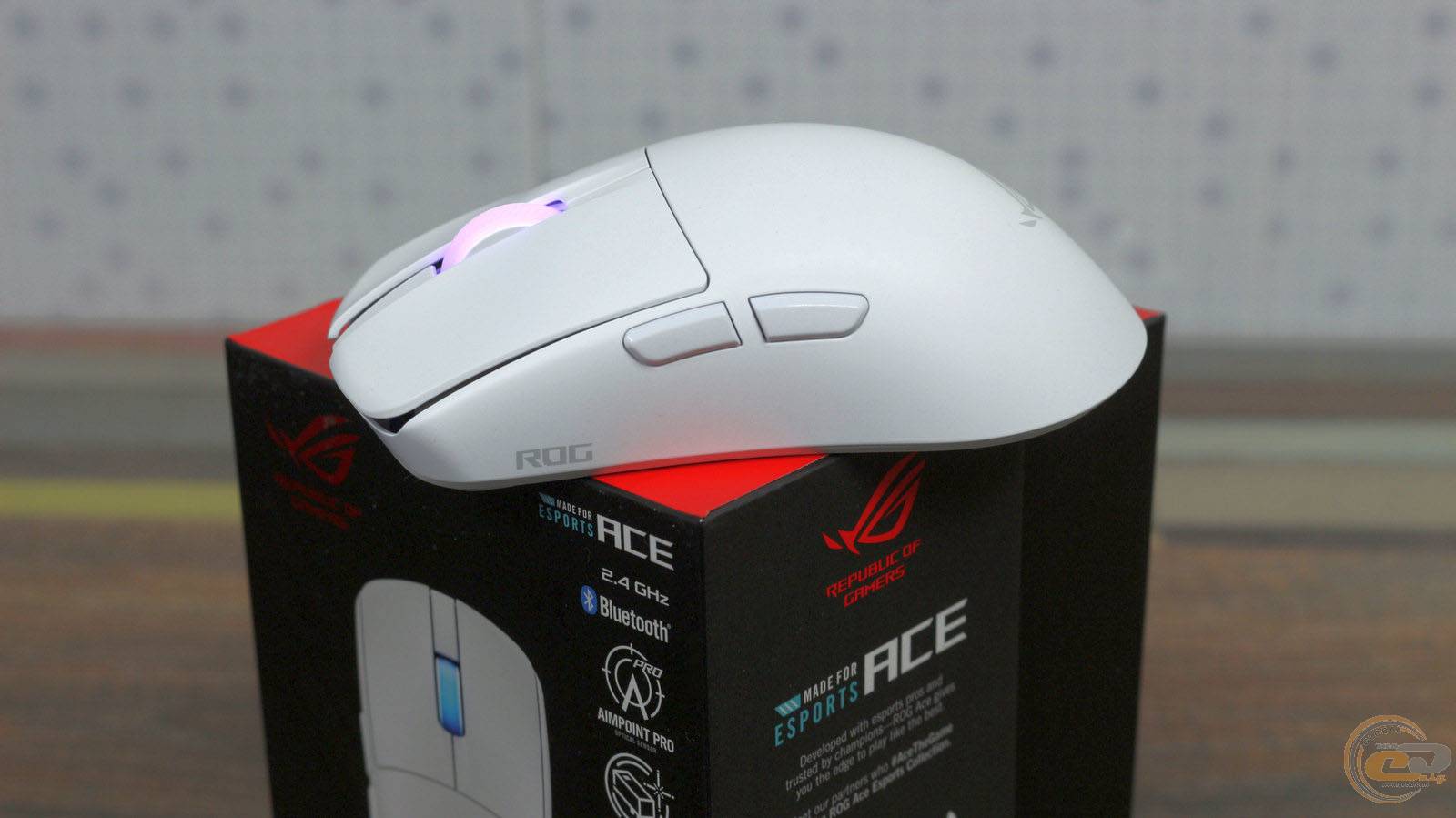 ASUS ROG Harpe II Ace – это турнирная мышь с белым корпусом, прозрачным скролом с RGB-подсветкой и серым логотипом ROG на спинке. На боках надпись ACE с тремя полосками с одной стороны и логотип ROG с другой.