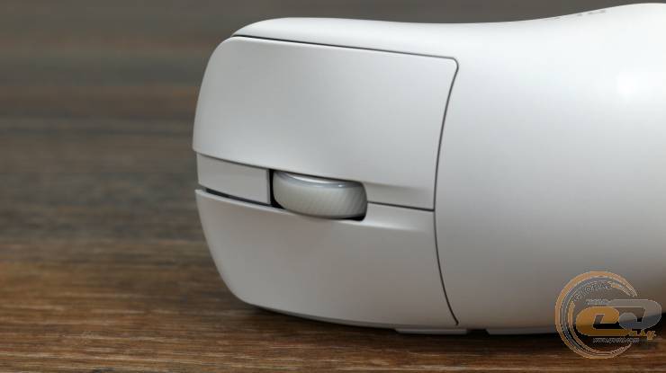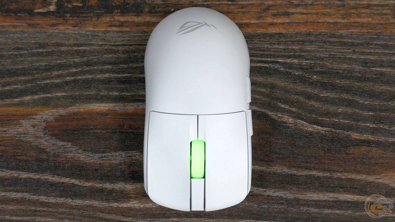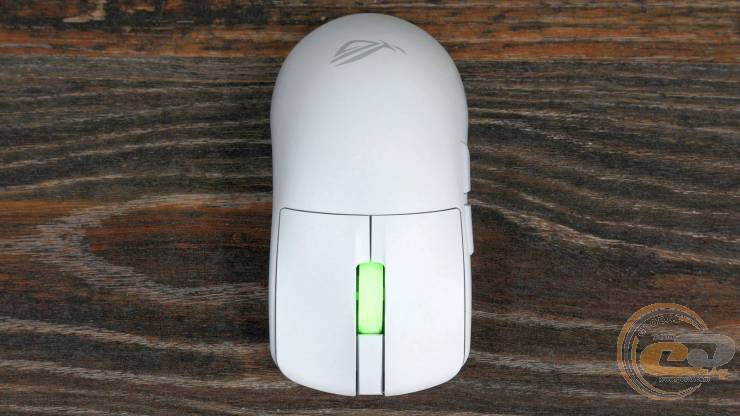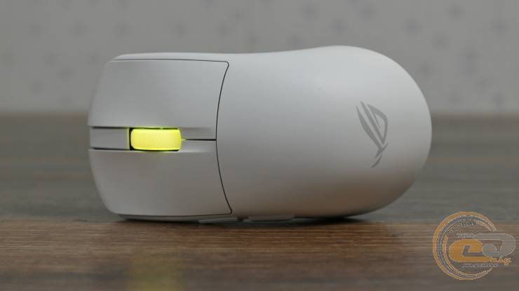 Колесо прокрутки расположено между основными кнопками, с легким углублением в передней части. Оно оснащено полупрозрачным резиновым протектором с текстурой, обеспечивающей четкое сцепление пальца. Поддерживается RGB-подсветка, изменяющаяся в зависимости от режима работы. Это единственная зона подсветки у мыши, что вполне логично ввиду ее минимального веса.