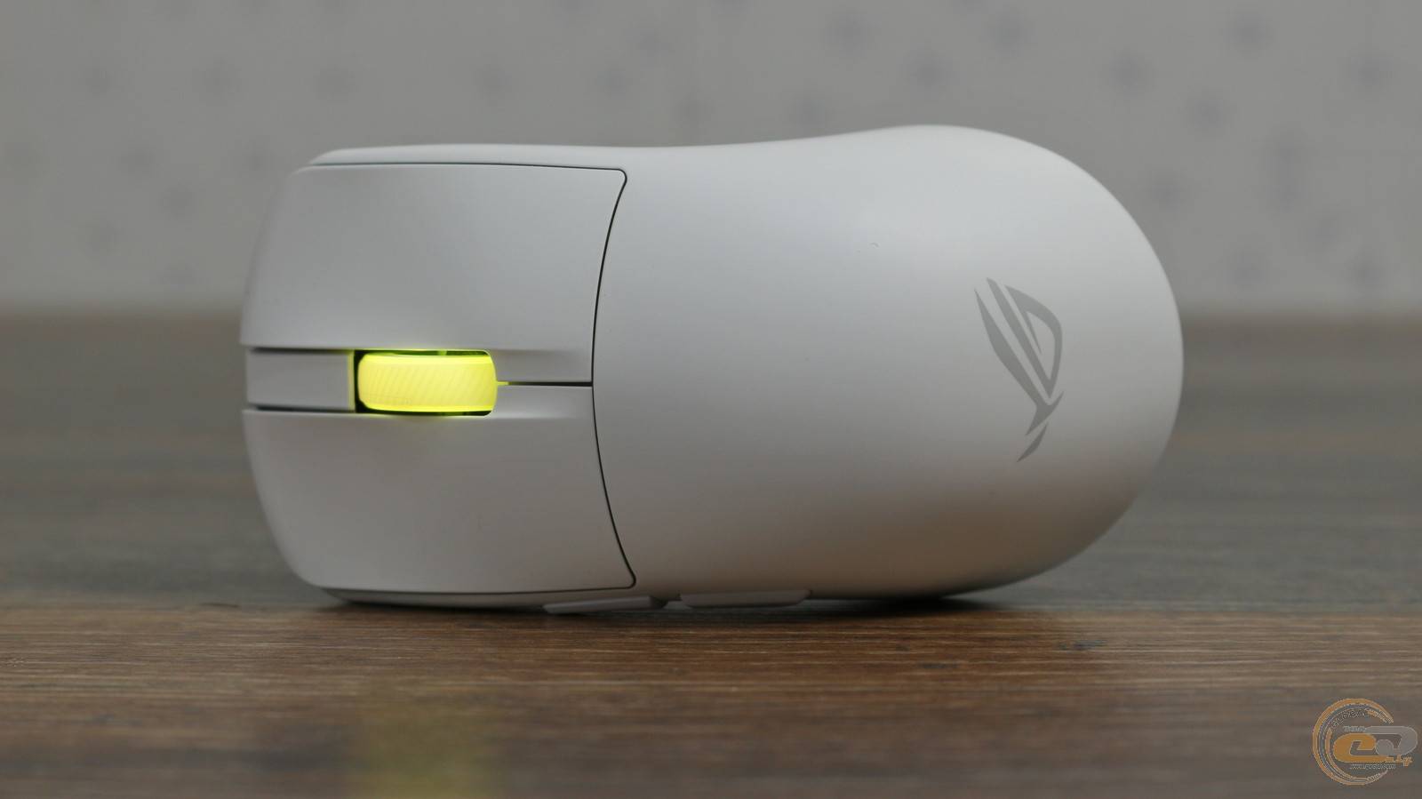 Под кнопками установлены оптические переключатели ROG Optical Micro Switches. У них нет дебаунса, не склонны к даблкликам, и рассчитаны на ресурс до 100 млн нажатий. Усилие нажатия — очень мягкое, значительно легче классических механических переключателей. Это позволяет спамить клики без усталости, но может не понравиться тем, кто привык к глубокому тактильному отклику. Клик – быстрый, четкий, но без упругого отскока, присущего обычным механическим переключателям. Звук нажатия – громкий, звонкий, без металлического призвука.