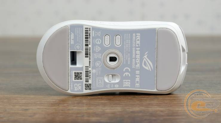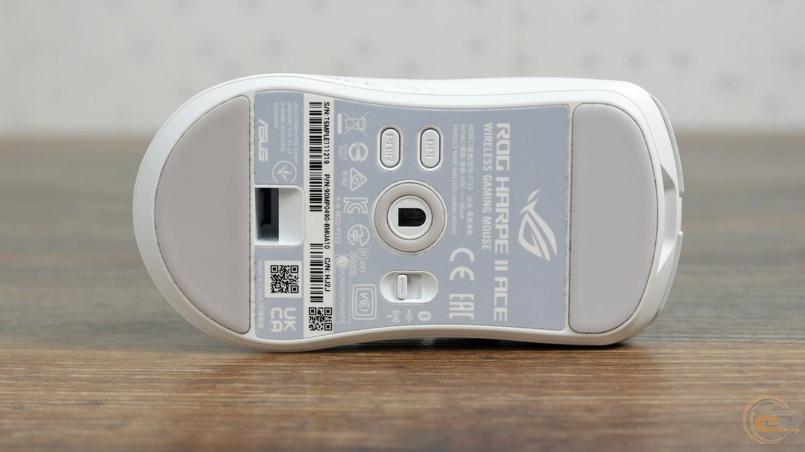 Дно Harpe II Ace также выполнено из бионейлона, но имеет гладкую текстуру. Оно оснащено двумя большими PTFE-ножками – одна спереди, одна сзади. Их края имеют 2.5D-обработку: они слегка скруглены, что снижает сопротивление на мягких ковриках и улучшает плавность микроускорений. Дополнительные отверстия для удобной замены ножек не предусмотрены. Над задней ножкой расположено отверстие для хранения наноресивера. Вся поверхность дна, кроме ножек, покрыта серым стикером с технической информацией.