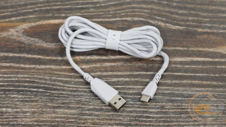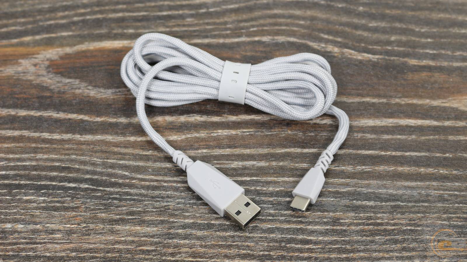 Зарядный кабель имеет длину около 1,8 м при толщине 3,3 мм. Он изготовлен из мягкого и гибкого материала и обернут в надежную нейлоновую оплетку Paracord, что обеспечивает дополнительную долговечность. На одном конце – разъем USB Type-A, а на другом – USB Type-C, оба из которых имеют защиту от перегиба, что предотвращает от повреждения. Несмотря на среднюю гибкость, играть во время подзарядки вполне комфортно – без заметных ограничений.