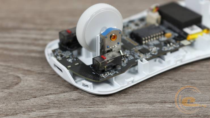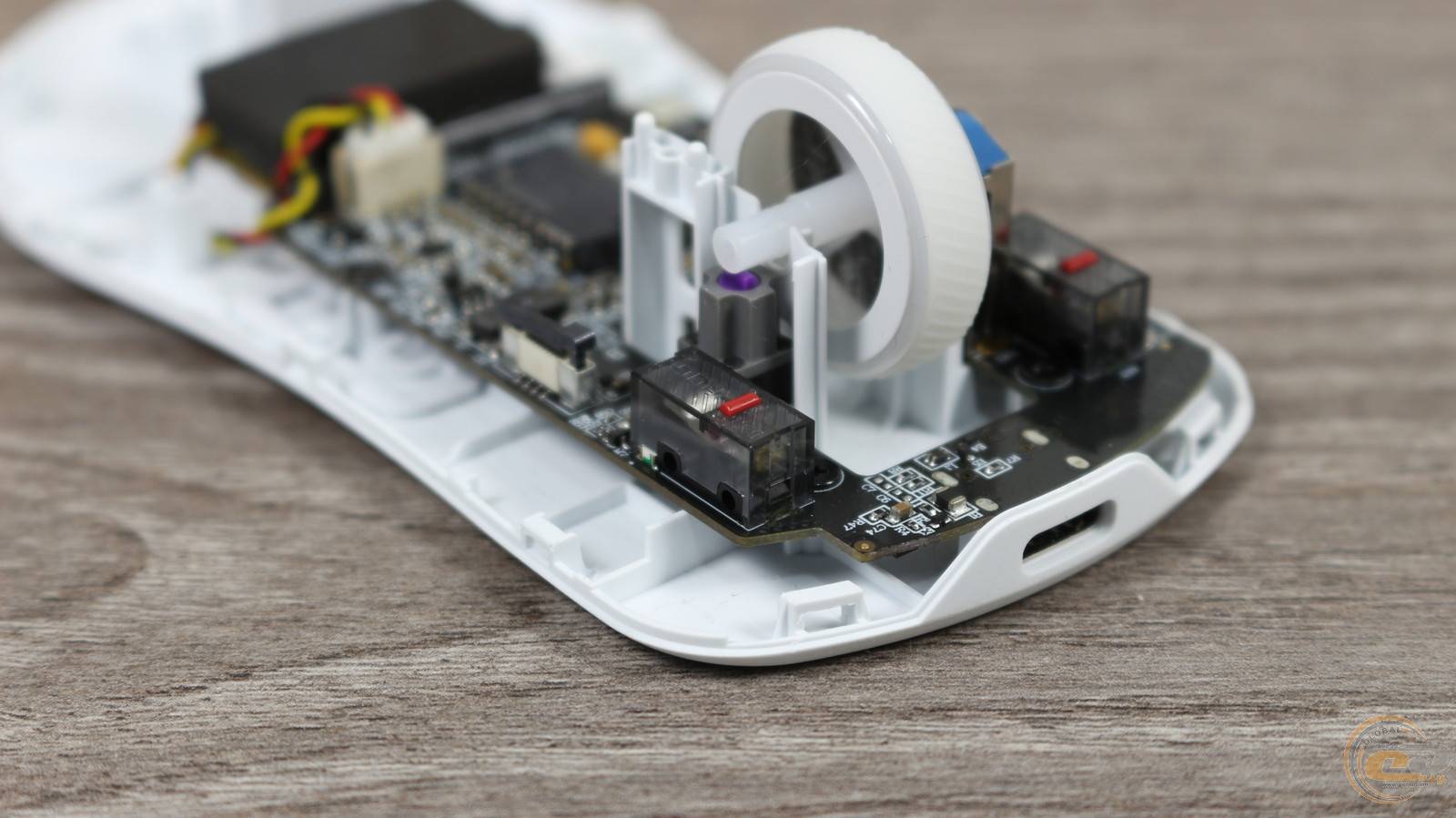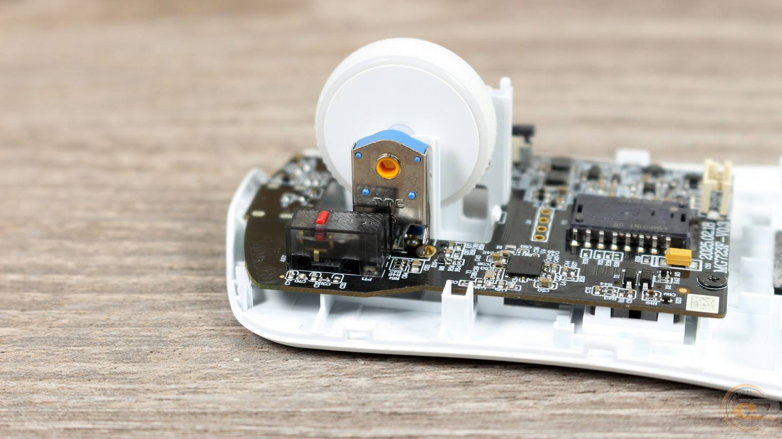 Над сенсором расположено прямоугольное отверстие для колесика прокрутки. Слева от него – механический энкодер TTC Gold Dust Proof с 24 четкими отсечками, пылезащищенным корпусом и ресурсом более 100 млн оборотов. Скролл работает стабильно, без паразитных импульсов, с равномерной тактильной отдачей. По сравнению с оптическими решениями здесь все контролируемо, без люфтов и случайных прокруток. Производителя переключателя скрола идентифицировать не удалось.