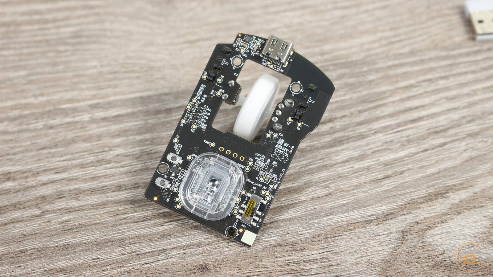 Центральным элементом выступает миниатюрная плата с сенсором ROG AimPoint Pro (кастомизированный PixArt PAW3950), обеспечивающая идеальное отслеживание без сглаживания по всему диапазону DPI. Все его характеристики – на максимальном уровне среди актуальных сенсоров. За беспроводную связь отвечает энергоэффективный чипсет Nordic nRF54H20.