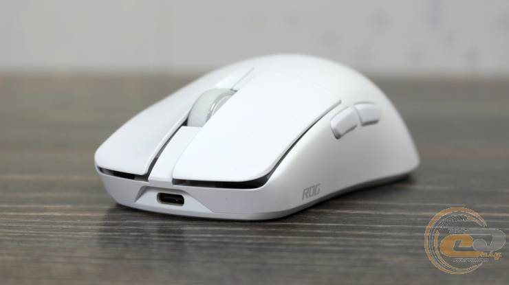 Форма мыши симметричная, с холмом ближе к центру. На задней части спинки нанесен логотип ROG серого цвета. Талия – суженная, мышь легко поднимать. Геометрия адаптирована для хвата пальцами и когтем: пониженный изгиб корпуса позволяет точный контроль, сохраняя поддержку ладони. Размеры – 126,1 × 63,9 × 39,7 мм, а высота передней части – 12 мм.
