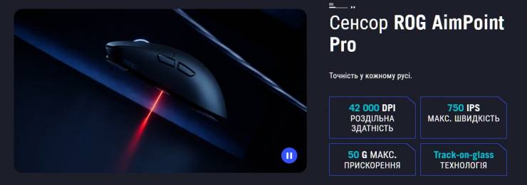 - ультралегкий вес 48 г и топовый фирменный сенсор ROG AimPoint Pro обеспечивают мгновенную реакцию и идеальное отслеживание движений;