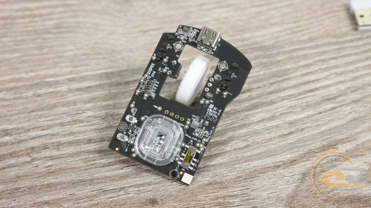 На противоположной стороне платы находится линза сенсора, два микропереключателя кнопок PAIR и DPI, регулятор режима подключения и разъем USB-C.