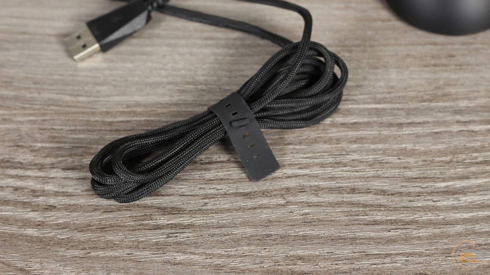 Кабель несъемный, имеет длину 2 м и разъем USB Type-A. Он выведен через фронтальную часть корпуса с небольшим наклоном вверх; место входа имеет уплотнение и защиту от перегиба. Оплетка ROG Paracord — гибкая, легкая, с минимальным сопротивлением. Хотя заводская скрутка может оставлять постоянные перегибы в местах сгибов, кабель хорошо скользит по столу и коврику и не создает ощутимого сопротивления.