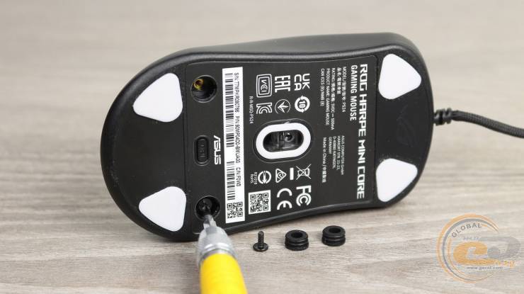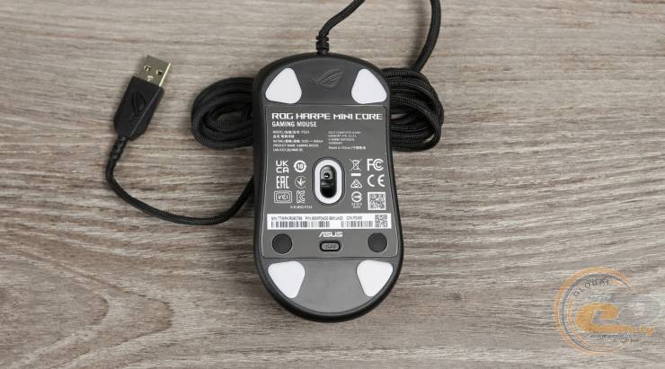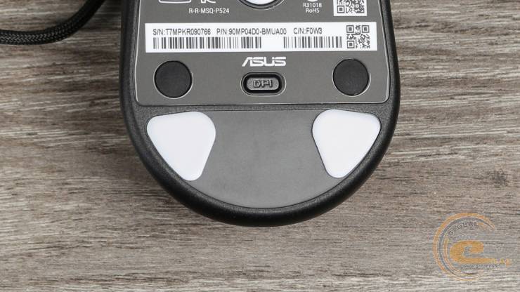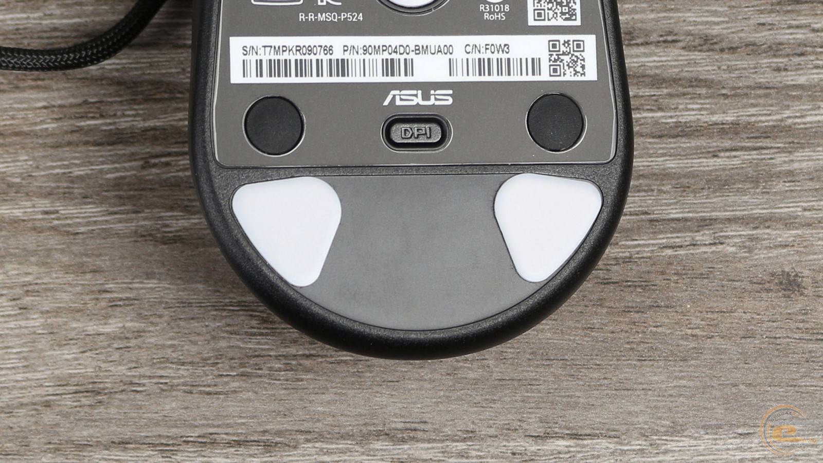 На нижней части расположены пять глайдов из белого PTFE: четыре основные треугольные формы по углам и один овальный вокруг сенсора. Все скругленные края и изготовлены из 100% чистого тефлона, как подчеркивает производитель. Отверстий для замены глайдов не предусмотрено, как запасного комплекта ножек. Между передними ножками тиснением нанесен логотип ROG.