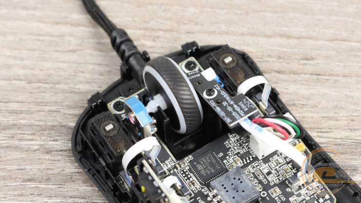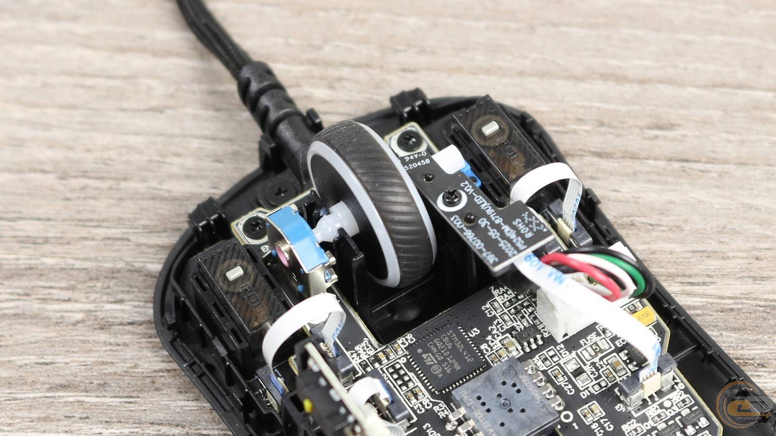 Прокрутка почти бесшумная, с четкими тактильными шагами. Нажатие требует среднего усилия, люфт отсутствует.