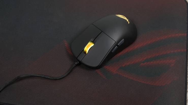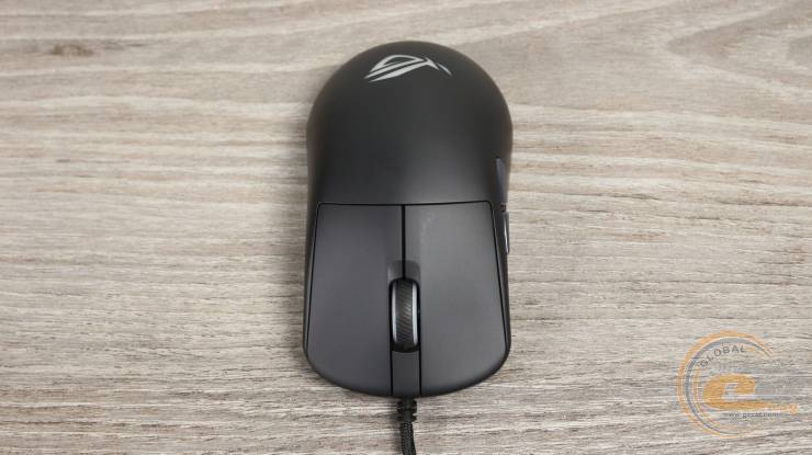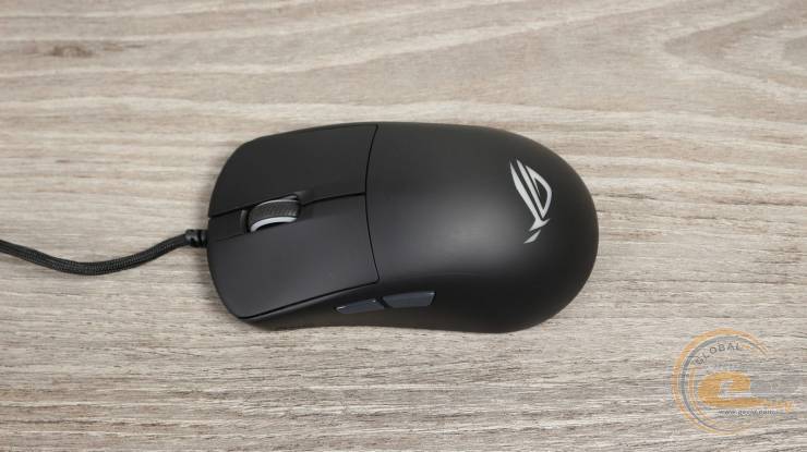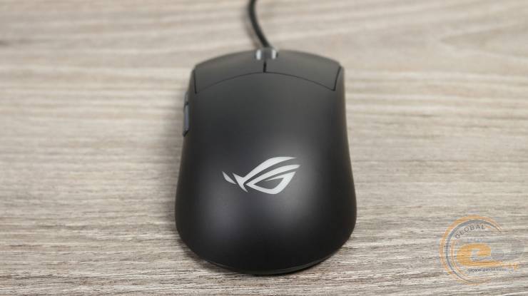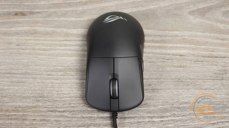 Ближе к задней части нанесен логотип ROG. В отличие от предыдущей модели, где он был просто серой печатью, здесь он получил RGB-подсветку, которая синхронизируется с колесиком и поддерживает ASUS Aura Sync.