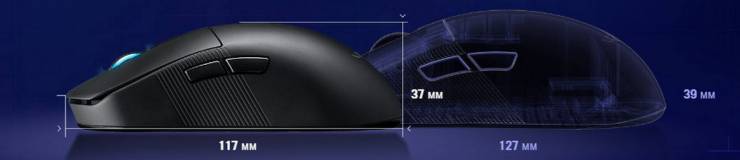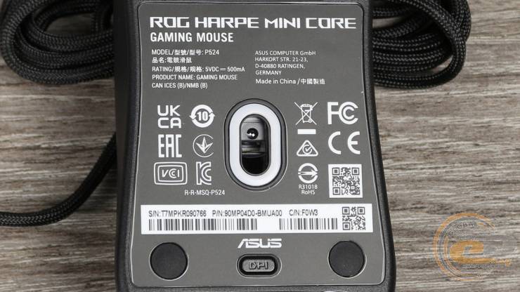 Ниже расположено отверстие для линзы, подсвеченное инфракрасным светодиодом. Рядом находится RGB-светодиод, подсвечивающий логотип ROG на спинке мыши.