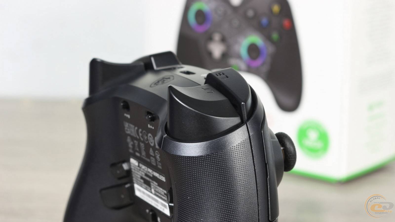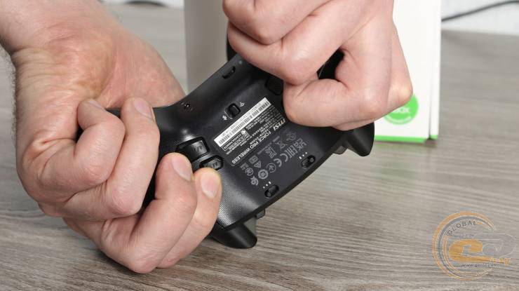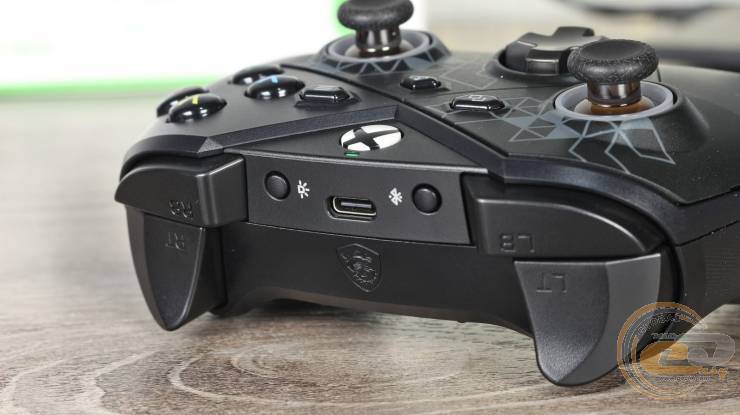 Нижняя панель также богата элементами: сверху расположены трехуровневые блокаторы триггеров, дополнительные клавиши M1/M2/M3/M4 и переключатель беспроводных режимов. Напомним, что в Microsoft Xbox Elite Wireless Controller Series 2 также есть упомянутые четыре кнопки, но там они реализованы в виде лепестков разной длины. А вот у стандартного Microsoft Xbox Wireless Controller их и вовсе нет.