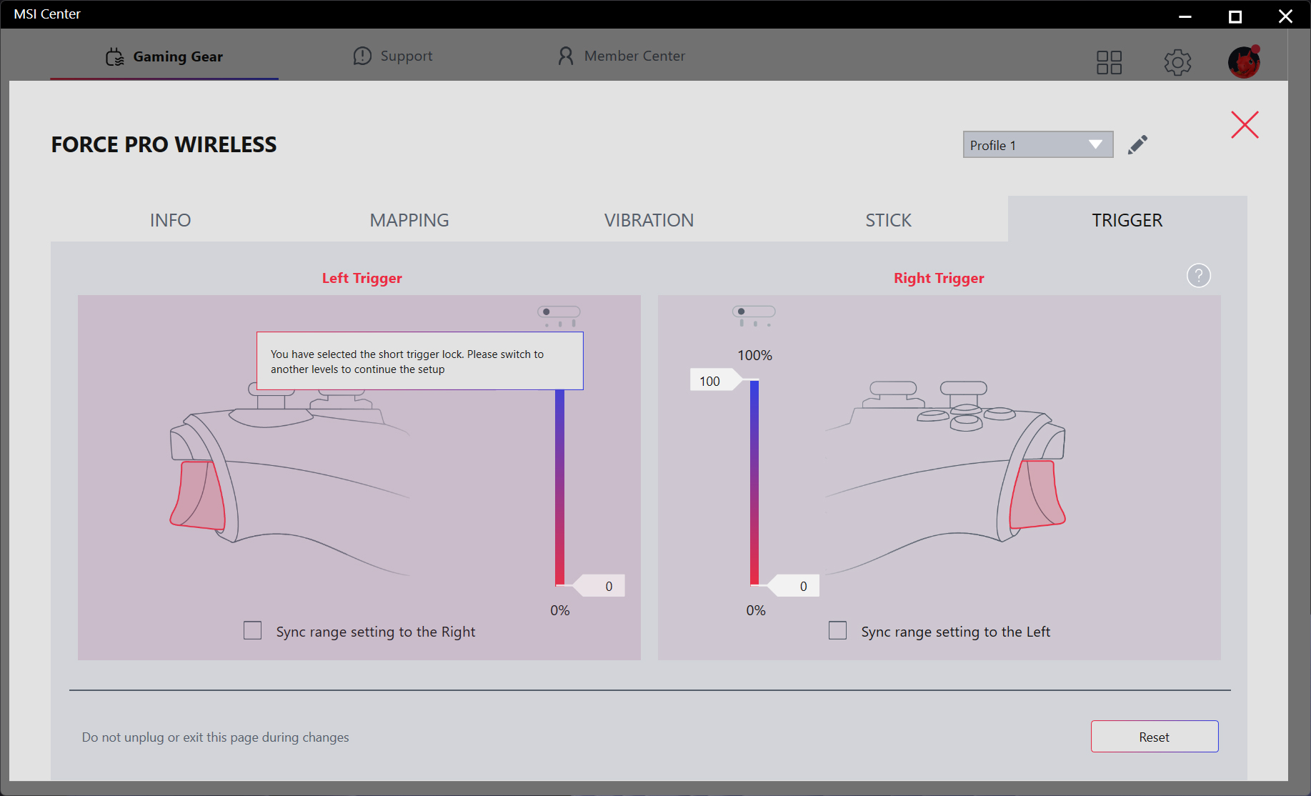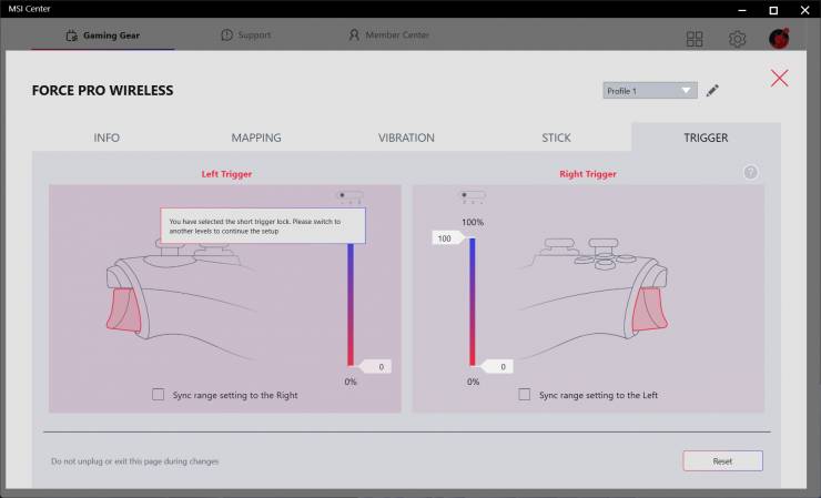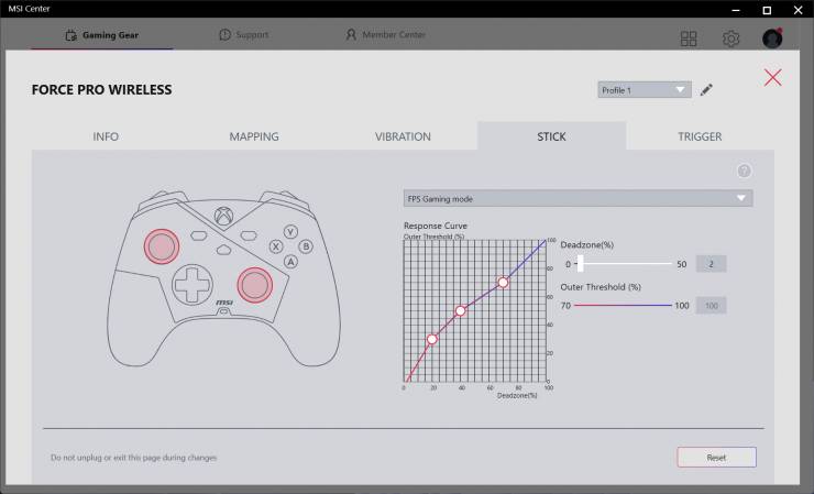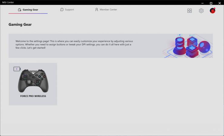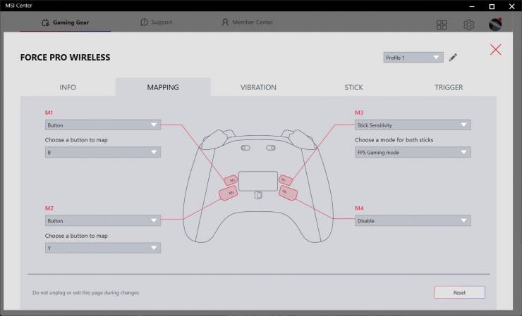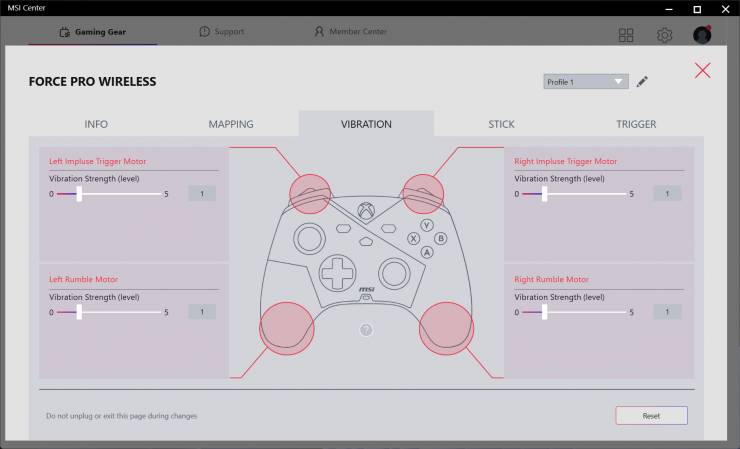 С помощью MSI Center в разделе «Gaming Gear» можно настроить под себя контроллер, для чего доступны пять вкладок: