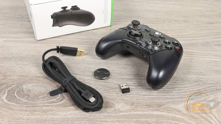 В комплект входят три элемента: кабель USB Type-C – USB Type-A, адаптер для беспроводного подключения и сменная насадка D-pad.
