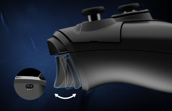 Теперь несколько слов о вибромоторах. Их здесь четыре: по два в курках и в рукоятке. Разумеется, это обычные вибромоторы типа Rumble. При настройке по умолчанию (уровень 1 в фирменном ПО) они работают довольно приятно, без лишнего грохота или других нехарактерных звуков, обеспечивая хорошую обратную тактильную связь в играх. А вот в момент подключения контроллера к ПК с помощью кабеля, вибромоторы на триггерах срабатывают с максимальной силой – достаточно громко и, честно говоря, не слишком приятно.