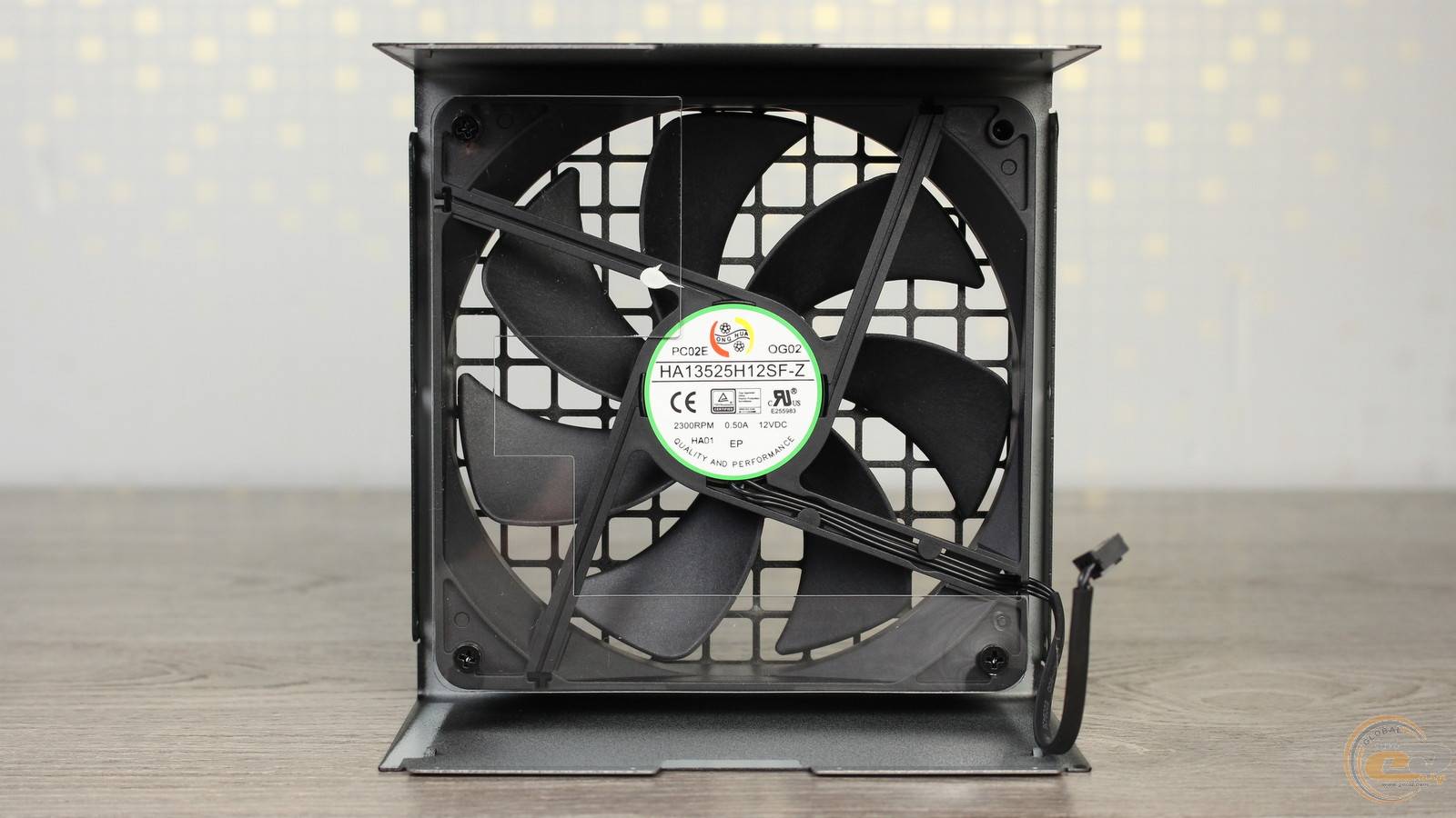 135-мм вентилятор HONG HUA HA13525H12SF-Z на основе надежного гидродинамического подшипника (FDB) нам уже приходилось встречать внутри других источников питания преимущественно из верхнего ценового сегмента. Его энергопотребление не превышает 6 Вт (12 В при 0,5 А), максимальная скорость вращения достигает 2300 об/мин, а для питания используется 3-контактный коннектор.