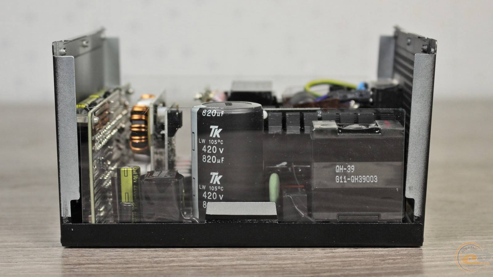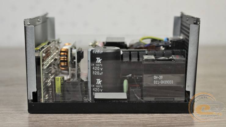 Входной конденсатор изготовлен японской компанией TK. Это высокотемпературное решение емкостью 820 мкФ, что является достаточно посредственным показателем для устройства мощностью 1200 Вт.