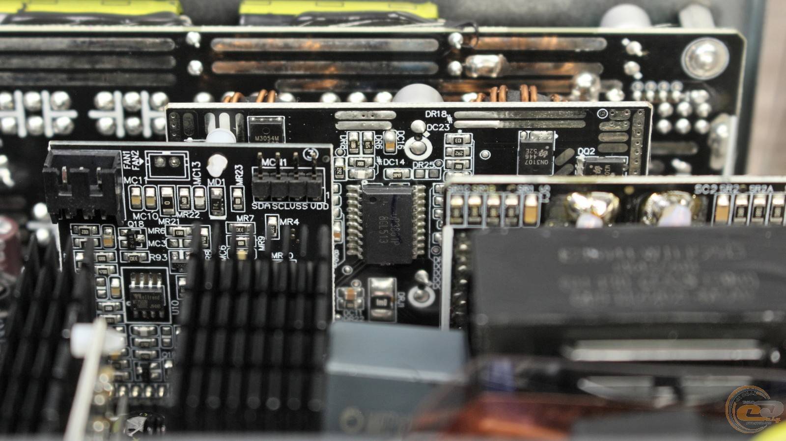 Три радиатора внутри DeepCool PN1200M охлаждают диодные сборки, силовые элементы узла APFC и ключи первичного преобразователя. Также металлические пластины помогают отводить тепло от транзисторов вторичной цепи.
