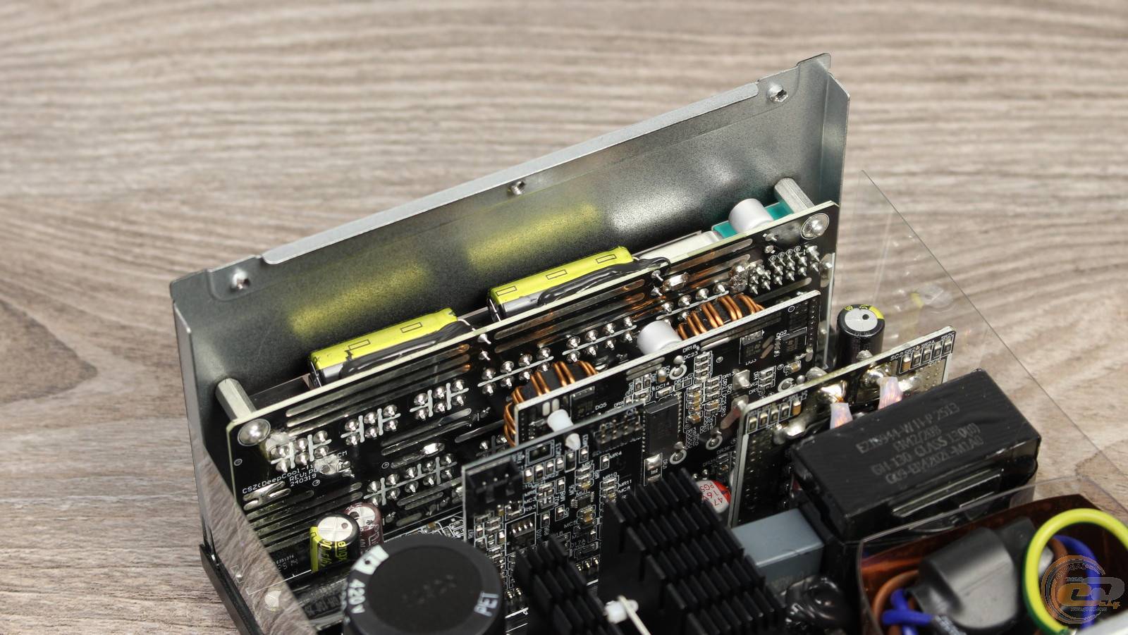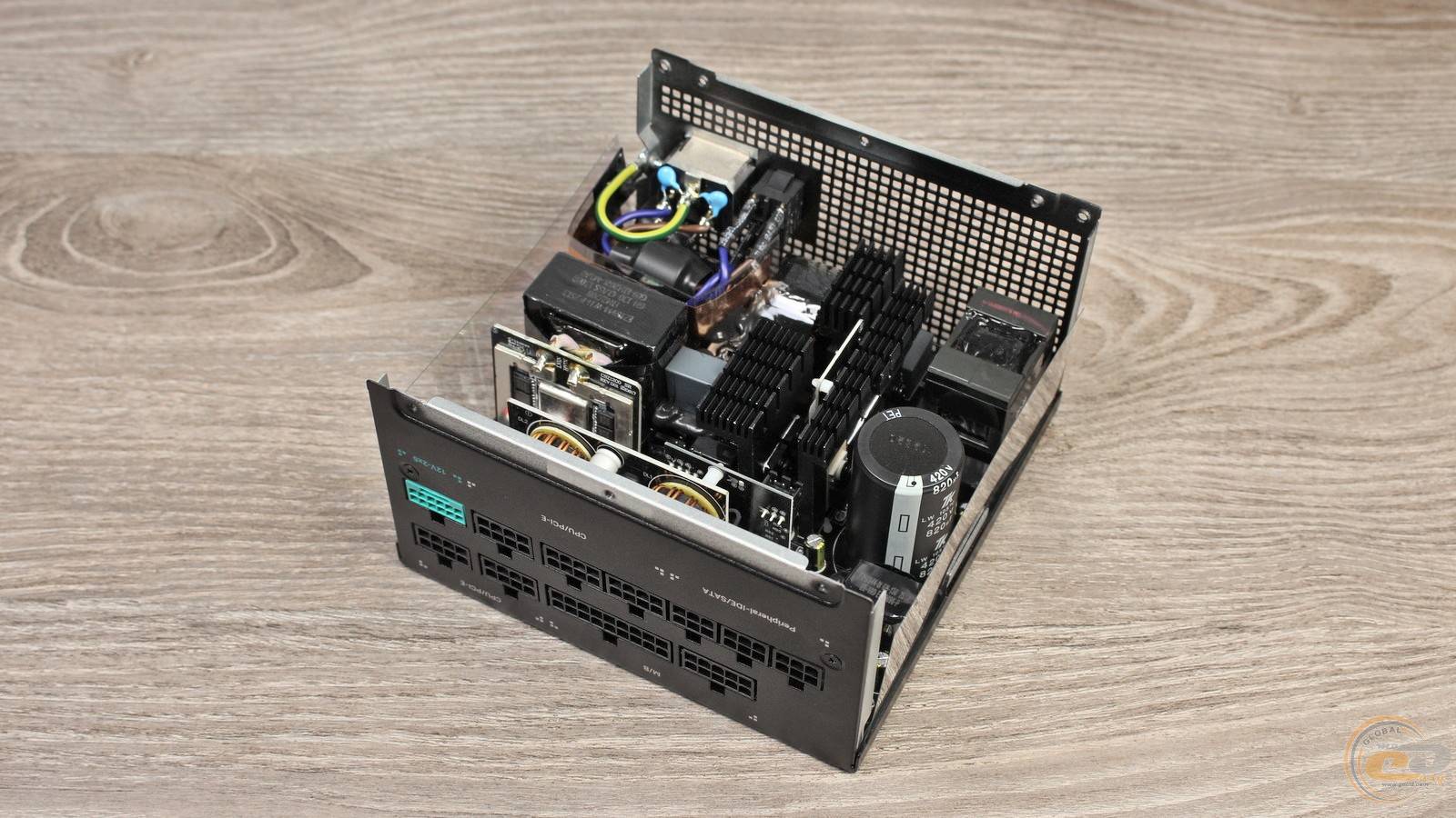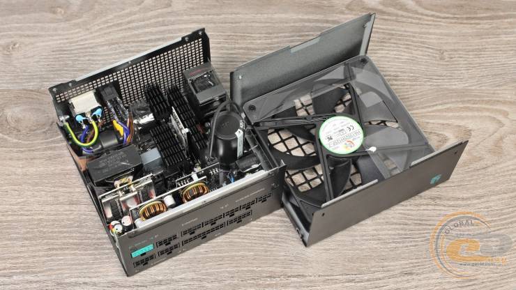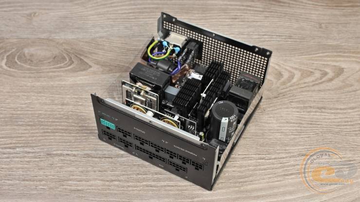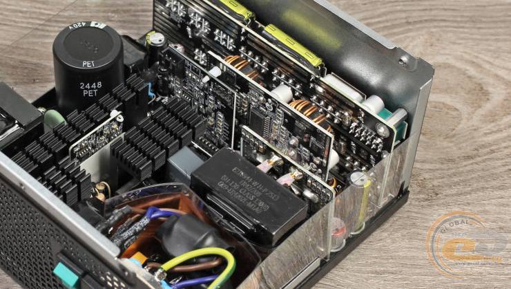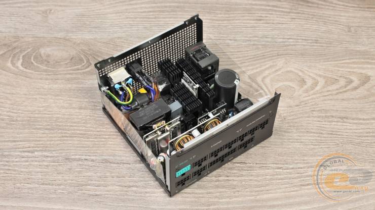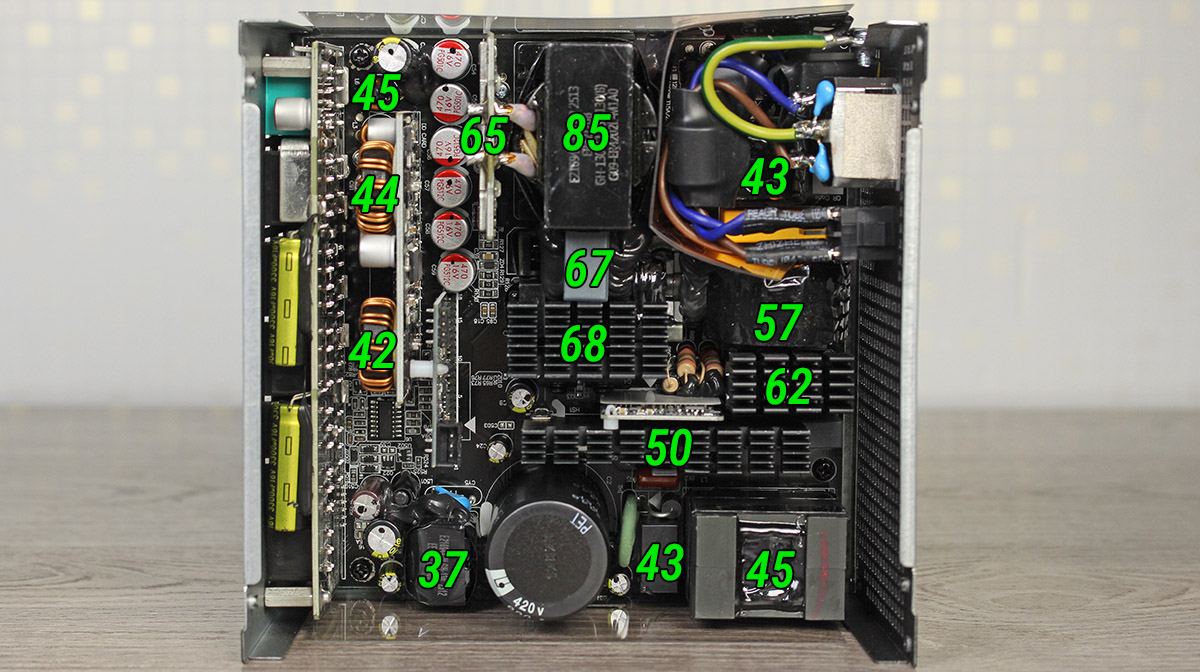 Устройство отличается довольно тихой работой и невысоким нагревом, что стало возможным благодаря КПД до 92%, подтвержденного сертификатами 80 PLUS Gold и Cybenetics Gold. В основе блока питания лежит полумостовая резонансная схема в сочетании с DC-DC-преобразователями, благодаря чему выходные напряжения имеют минимальные отклонения от номинала.