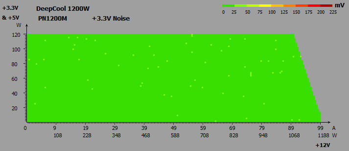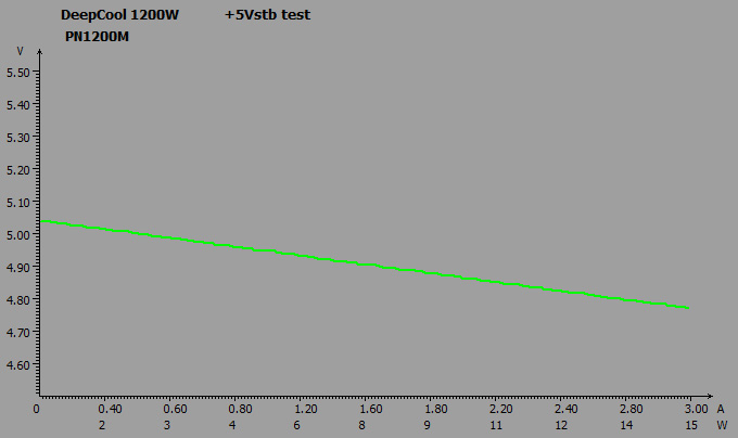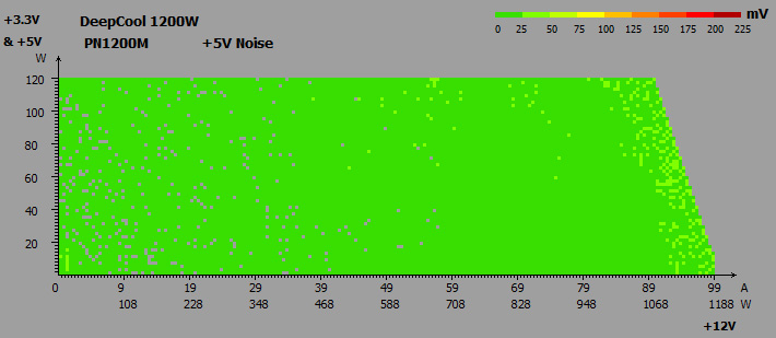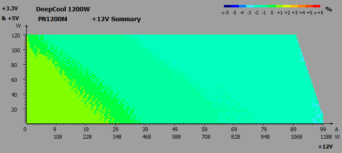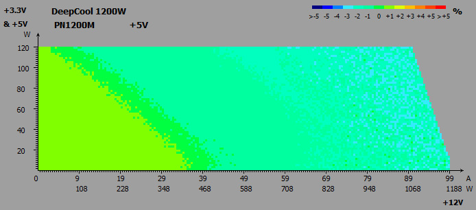 Раздельная стабилизация напряжений обеспечила незначительное их отклонение в пределах 0,9-4,2%, без просадок ниже номинала. Разница между показателями в простое и под нагрузкой составляла всего 0,6-2,1%, что также очень небольшое значение.