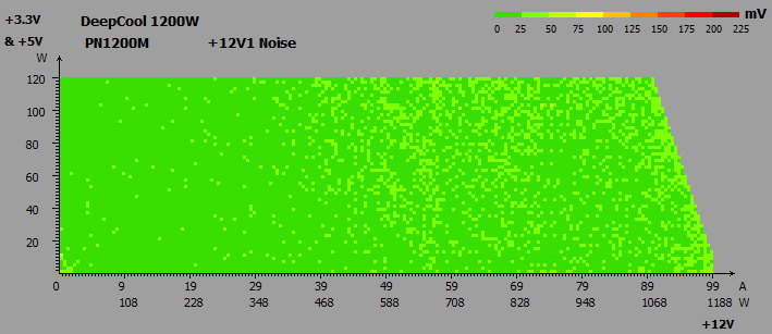 Модуль APFC, набранный в полном составе, хорошо справляется со своими обязанностями. Так, коэффициент PF достигает 0,9 при нагрузке в 180 Вт, а максимальное его значение равно 0,98 при номинальных 1200 Вт.