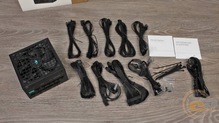 Все кабели DeepCool PN1200M модульные и набраны из круглых проводов калибром 18 AWG, тогда как 600-ваттный PCIe 5.1 (12V-2×6) получил более толстые жилы калибром 16 AWG. Набор доступных коннекторов одинаковый для всех устройств линейки DeepCool PN мощностью от 650 до 1200 Вт.