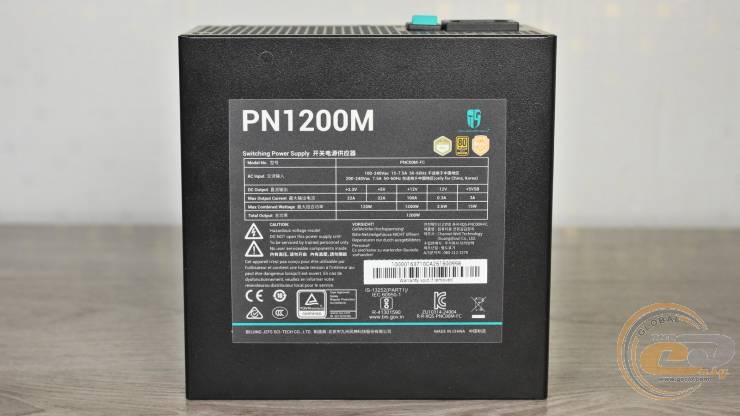 Согласно информации на этикетке, канал +12В способен выдавать все 1200 Вт мощности, что ожидаемо для модели с DC-DC-преобразователями. Линии +3,3В и +5В суммарно обеспечивают до 120 Вт нагрузки или максимум по 22 А каждая. Также заявлена поддержка широкого диапазона входных напряжений 100-240 В и соответствие стандартам 80 PLUS Gold и Cybenetics Gold.