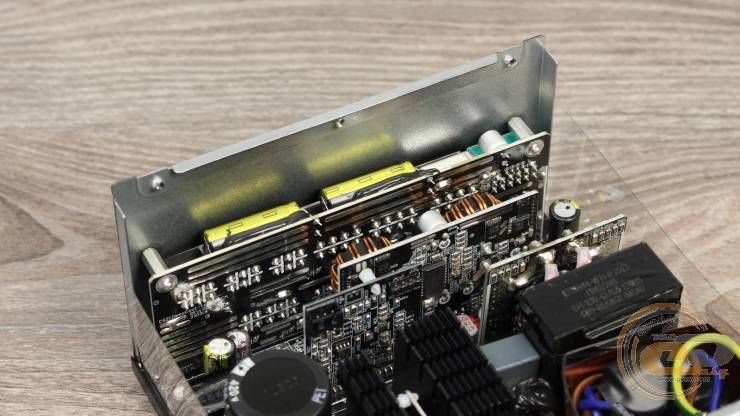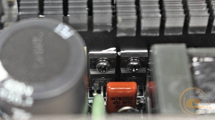 Блок питания построен на платформе хорошо известной компании CWT, в основе которой лежит резонансная полумостовая схема (Half Bridge). Ее ключами являются пара транзисторов, закрепленных на отдельном радиаторе.