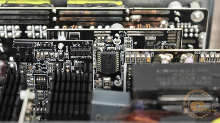 Еще одна вертикальная плата по соседству содержит составляющие DC-DC-преобразователей, с помощью которых формируются уже младшие каналы +3,3В и +5В.
