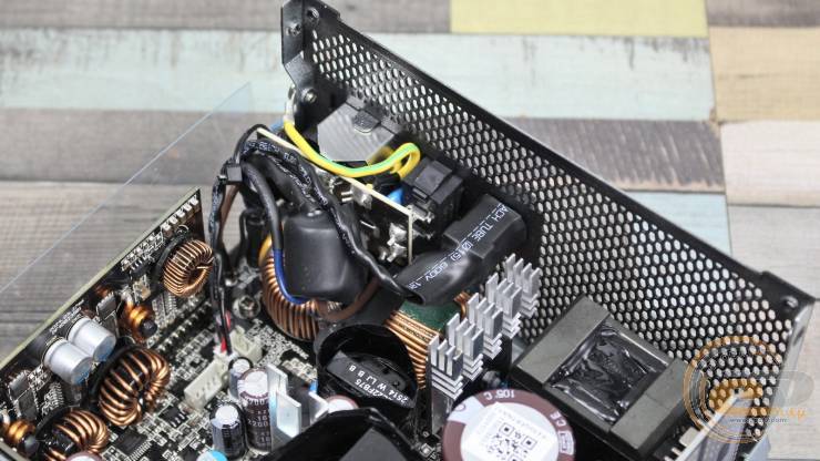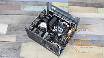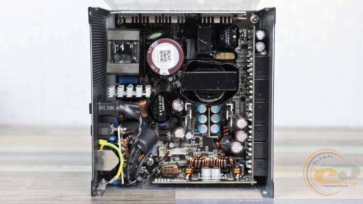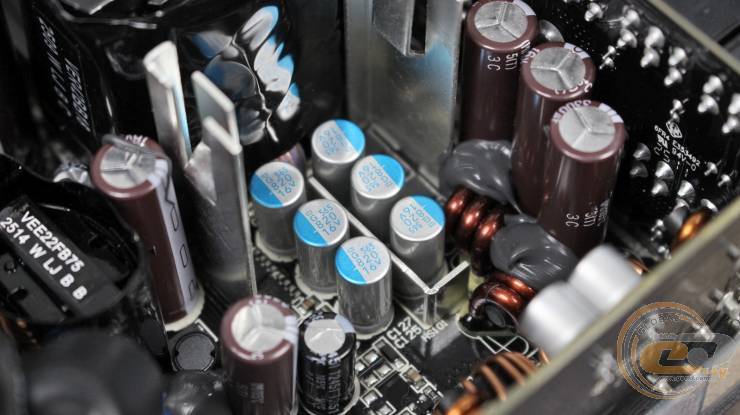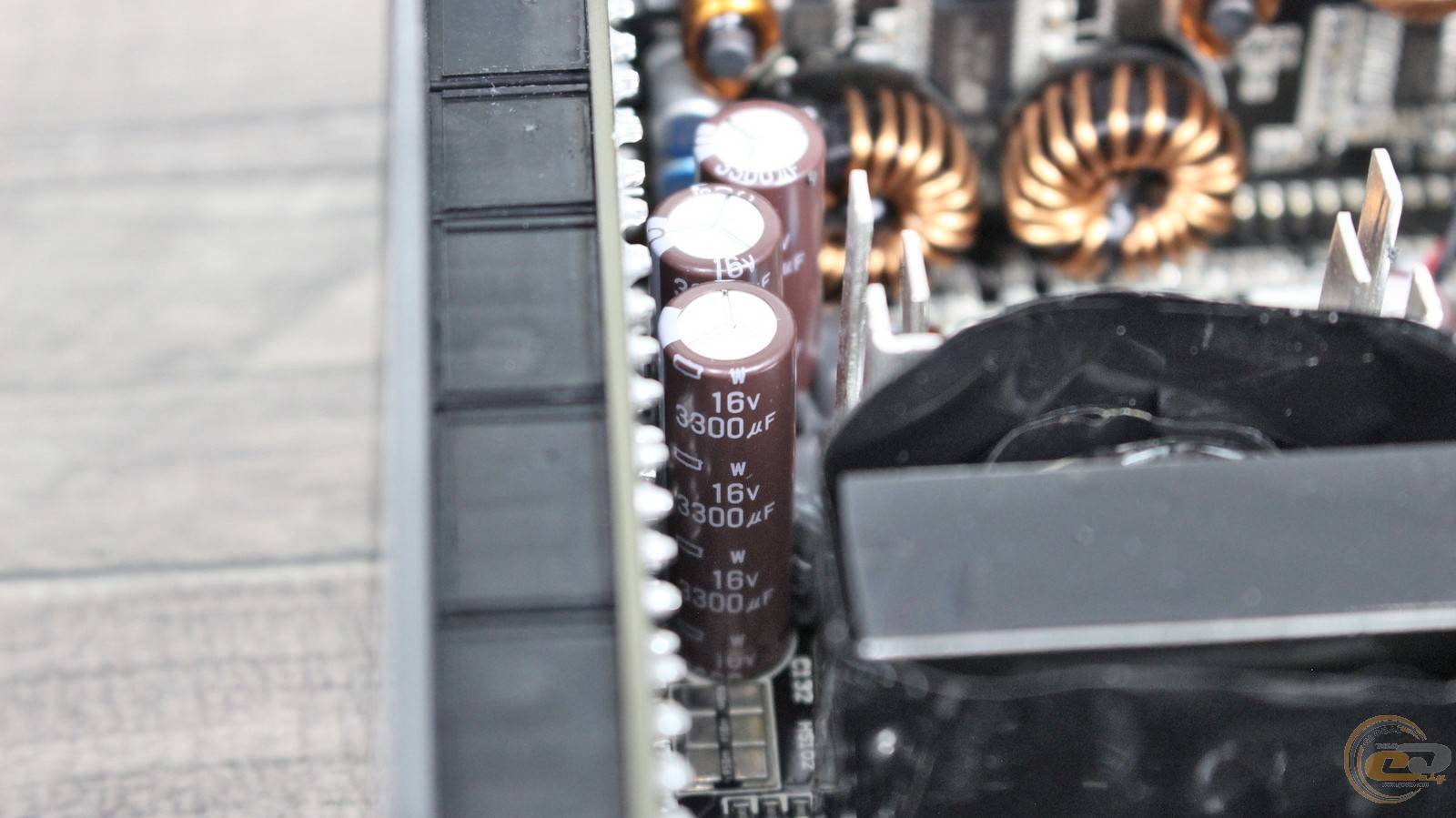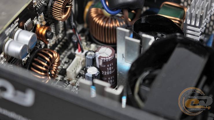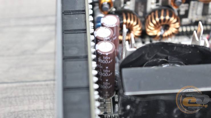 Выходные электротехнические характеристики остались неизменными. Так, 996 Вт по-прежнему доступны по линии +12В – а это возможно только для устройства с раздельной стабилизацией напряжения. Суммарная мощность младших каналов +3,3В и +5В составляет немалые 125 Вт, а каждый из них доступен по 25 А. Это очень хорошие характеристики, свойственные мощным решениям. А золотистый оттенок этикетки объясняется соответствием сертификата энергоэффективности 80 PLUS Gold.