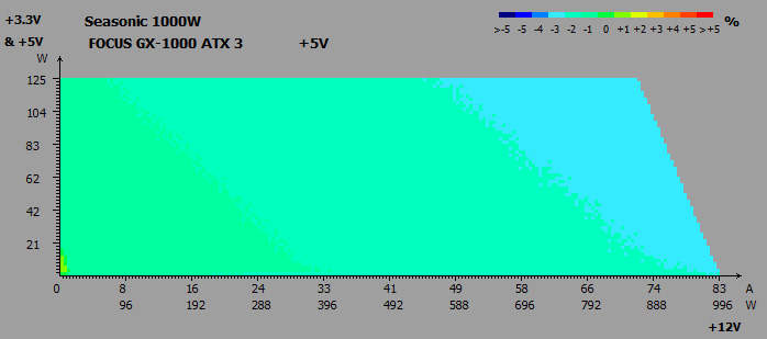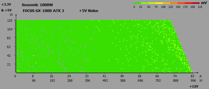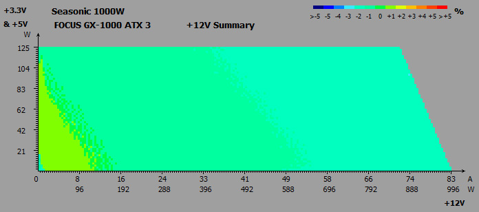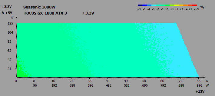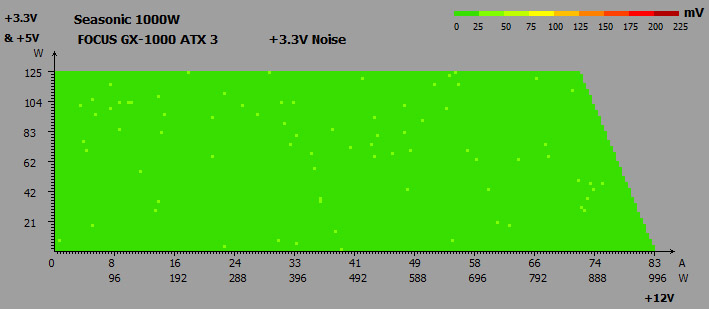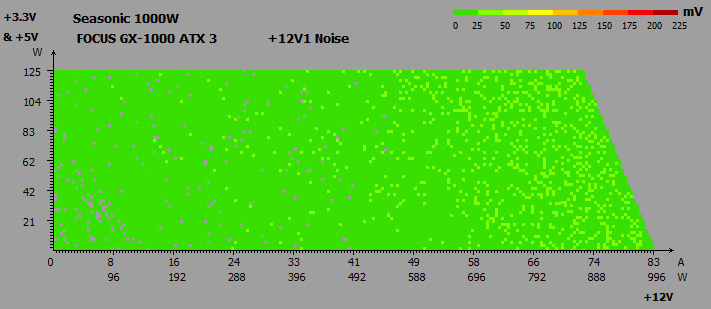 По всей видимости, даже требовательная система с сразу двумя горячими видеоадаптерами оказалась вполне «по зубам» тестируемого блока питания. Напряжения на всех трех линиях как в простое, так и под нагрузкой оставались в заявленных производителем 3-процентных пределах. А разница между значениями в простое и под нагрузкой составила всего 0,4-1,5%. Так что полученные показатели вполне заслуженно получают от нас оценку «отлично».