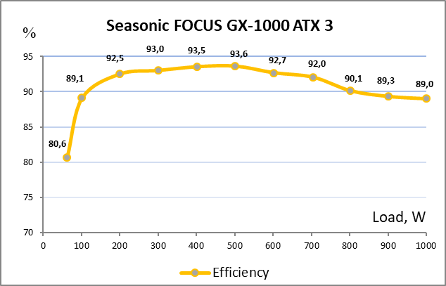 С соответствием КПД сертификата 80 PLUS Gold также полный порядок: при нагрузке 20%, 50% и 100% от номинальной мощности КПД превосходил 90%, 92% и 89% соответственно. А пиковое его значение достигает целых 93,6%.