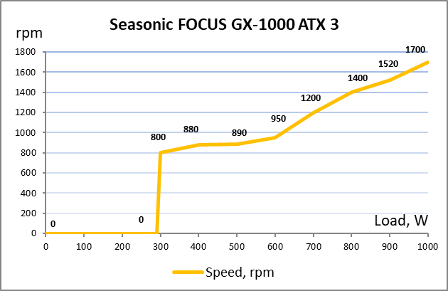 В диапазоне нагрузок 300-500 Вт производитель предусмотрел зону гистерезиса. Она позволяет избежать ситуации, когда вентилятор постоянно включается и выключается, балансируя между двумя режимами работы. Если же гибридный режим работы системы охлаждения отключен, вентилятор запускается сразу при подаче питания со скоростью 800 об/мин.
