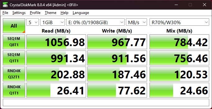 CrystalDiskMark, работающий уже с данными без сжатия, подтвердил заявленные характеристики, продемонстрировав еще более высокие результаты — 1056 МБ/с при чтении и 967 МБ/с при записи.